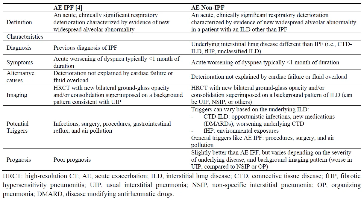 7]. While an AE-IPF has been defined, there is no separate, specific definition of an acute exacerbation in non-IPF ILD. The diagnostic criteria applied in most studies to define AE non-IPF are based on the same criteria suggested in the most recent American Thoracic Society Working Group Statement [