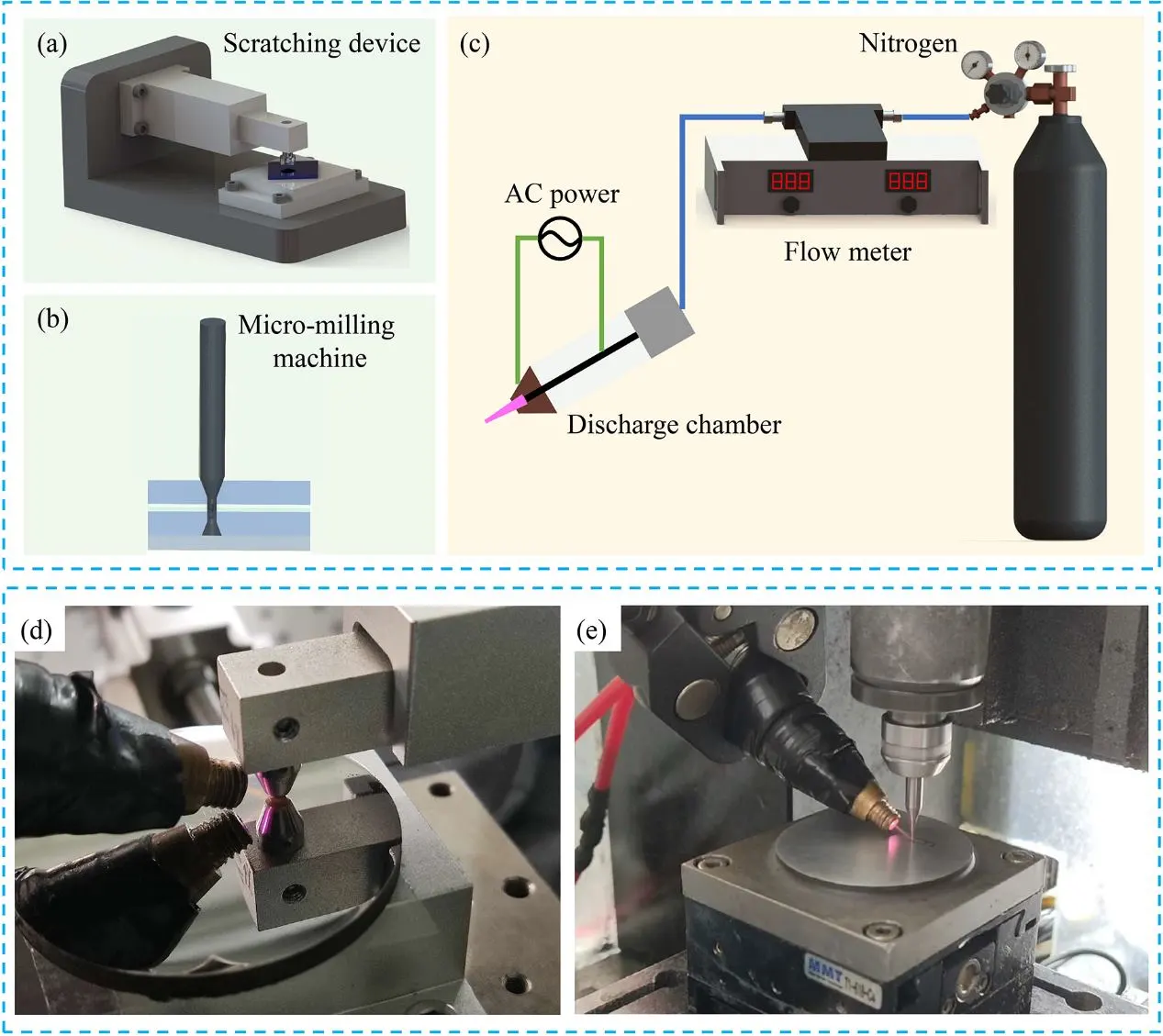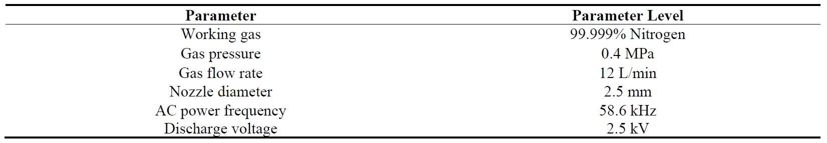 The CPJ generating device was mainly composed of a gas source, a flow meter, a low-frequency AC power supply and a discharge chamber. To achieve rapid modification of the material without affecting the micromorphology of the material surface, the CPJ was generated by bare electrode discharge. The discharge electrodes were composed of a high-voltage tungsten needle electrode and a low-voltage copper nozzle electrode, and there was no dielectric barrier such as a quartz tube between the electrodes. When nitrogen was introduced into the discharge chamber and a certain voltage was applied, a stable lavender CPJ could be generated. The temperature of the CPJ was about 30 ℃, and the length was about 15 mm, which could achieve rapid modification of the material processing area without causing serious thermal damages. The specific operating parameters are shown in . To avoid the influence of nitrogen gas flow on the machining process, nitrogen-assisted micro-milling experiments were carried out using the same gas pressure and flow rate in .