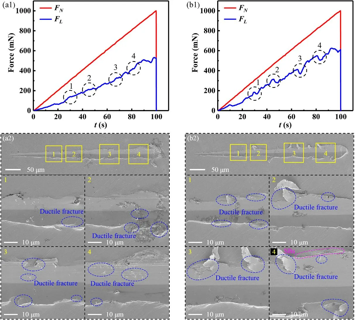 To further compare the differences in the removal process of materials with and without CPJ treatment, the micromorphologies of positions 1, 2, 3 and 4 corresponding to the load-time curve were measured, as shown in (a2,b2). The results manifested that the width and depth of scratched groove increased with the increase of