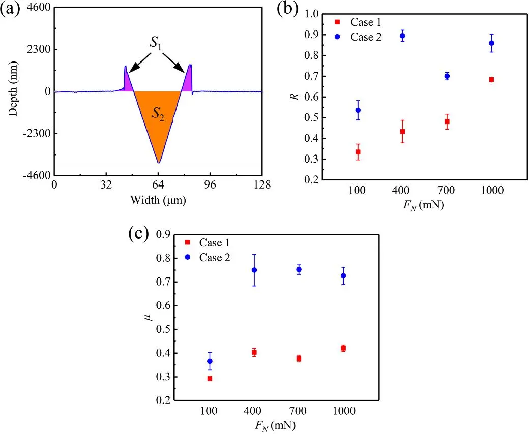 S2 was the area of the scratched groove cross-section, i.e., the area enclosed by the scratched profile curve below the depth baseline and the baseline. The schematic diagram about