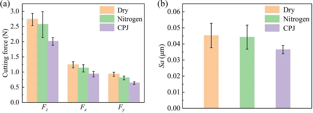 y directions under CPJ-assisted micro-milling were reduced by 26.5%, 24.8% and 31.3%, respectively, which was very favorable for improving cutting conditions and slowing down tool wear. Meanwhile, the surface roughness was also improved, and