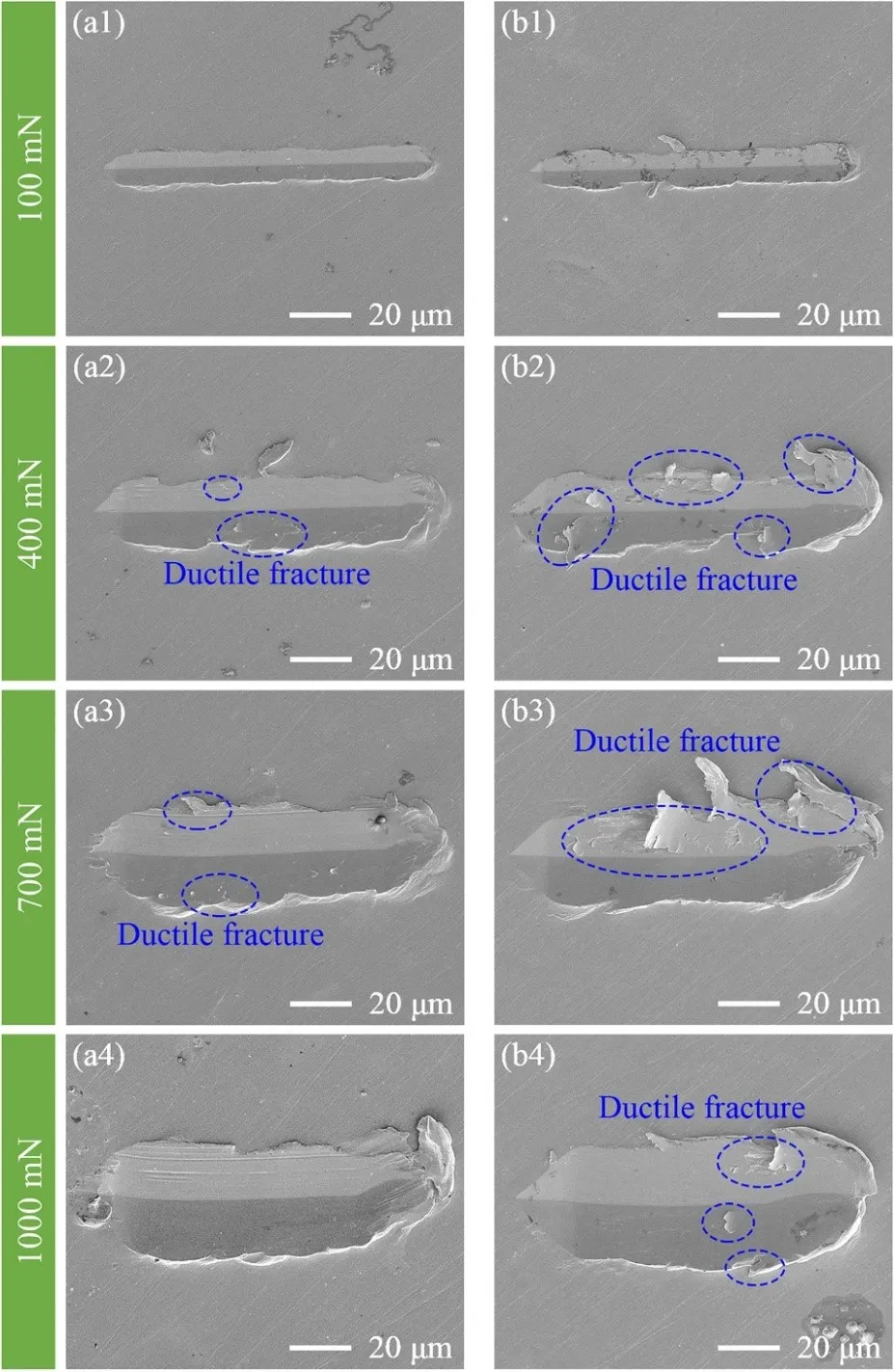 FN of 100 mN, 400 mN, 700 mN and 1000 mN, with a scratching speed of 5 μm/s. The obtained 2D and 3D scratched morphologies are shown in and . When the load was 100 mN, no ductile fracture occurred on the scratched surface with and without CPJ treatment, which was because the load was so low that the condition for material fracture was not reached (as shown in (a1,b1)). When the load increased to 400 mN, the ductile fracture was observed on both surfaces, and the length and number of cracks on the scratched surface after CPJ treatment increased compared with those before treatment (as shown in (a2,b2)). When the load was 700 mN, the length and number of cracks induced by CPJ-assisted scratching were also higher than those without CPJ assistance (as shown in (a3,b3)). When the load reached the maximum value of 1000 mN, no obvious ductile fracture was observed on the scratched surface without CPJ treatment, while ductile fracture occurred on the scratched surface after treatment (as shown in (a4,b4)). From the 3D scratched morphologies in , it could be seen that the residual scratched depth after CPJ treatment was increased compared with that before treatment. In addition, there were more chip pileups at the scratched tail under