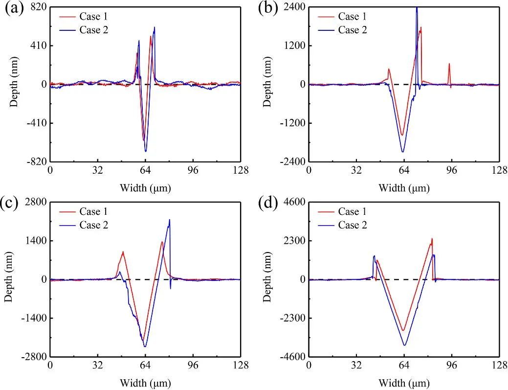 The residual scratched depth under different loads was measured along the scratched cross-section direction, as shown in . Case 1 and Case 2 represent the samples before and after CPJ treatment, respectively. Compared without CPJ treatment, it was found that the residual depth increased after CPJ treatment, and the scratched cross-sectional area also increased. To comprehensively evaluate the removal efficiency of the material before and after CPJ treatment, the parameter