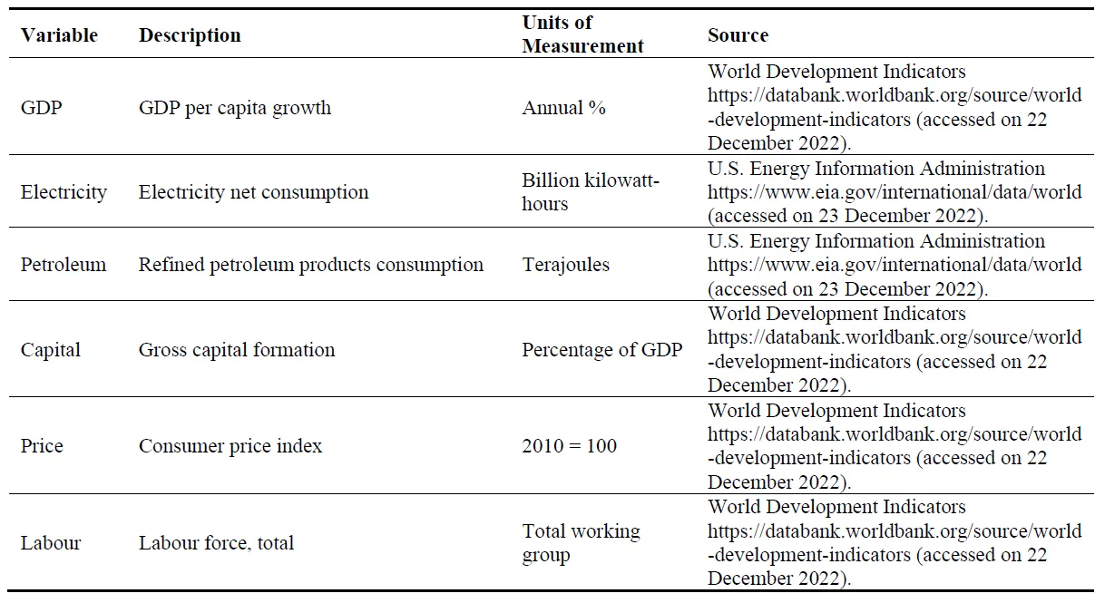 The study employs secondary data obtained from various databases. Economic data were sourced from the World Development Indicators, and energy consumption statistics were derived from the U.S. Energy Information Administration. A rigorous data validation process was undertaken to compare GDP growth and energy consumption figures across sources such as the International Monetary Fund, the United Nations Statistical Division, and the International Energy Agency. Demographic data were validated through comparison with the United Nations’ World Population Prospects. This comprehensive validation of data sources is crucial for ensuring the accuracy and reliability of the results [