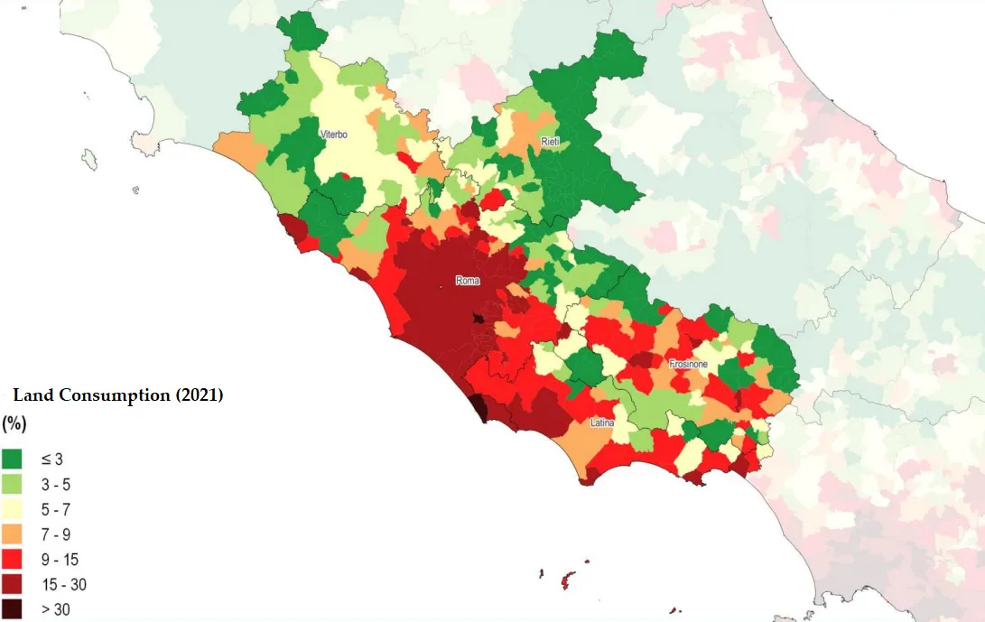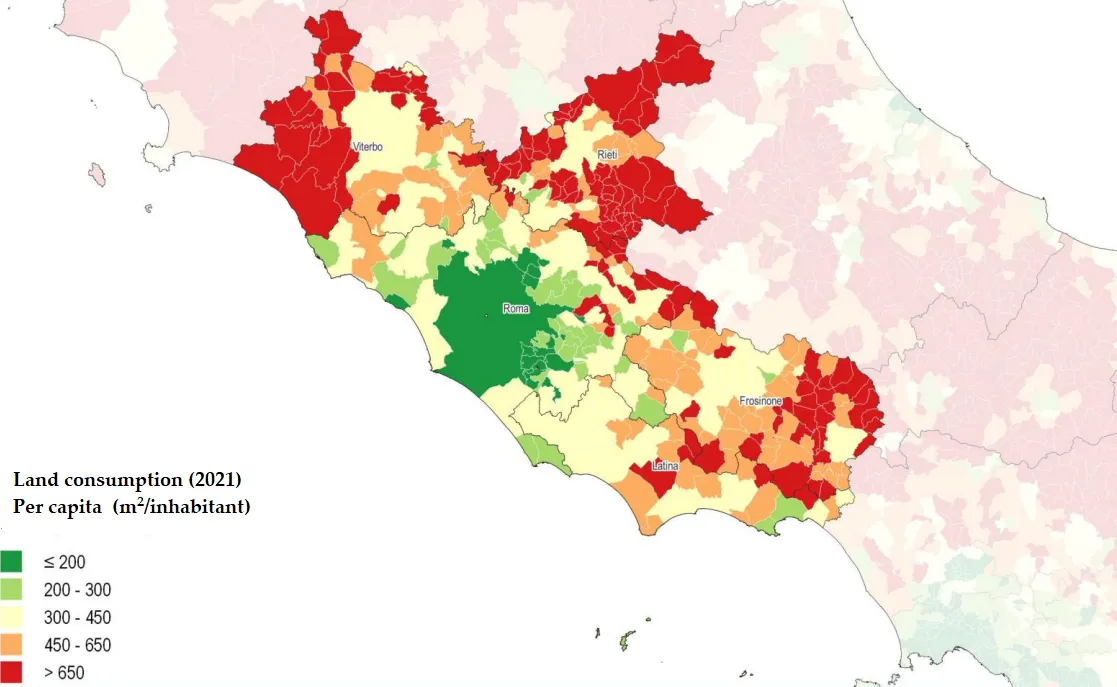 The density of net changes in 2021, i.e., land consumption in relation to land area, shows that in Lazio (), 0.71 square meters are consumed per hectare of land against a national average of 1.08 square meters per hectare. The metropolitan area of Rome shows a land take density of 0.31 square meters per hectare. In terms of land consumed per capita (), the regional value is equal to 244 square meters per inhabitant, below the national average (366 m