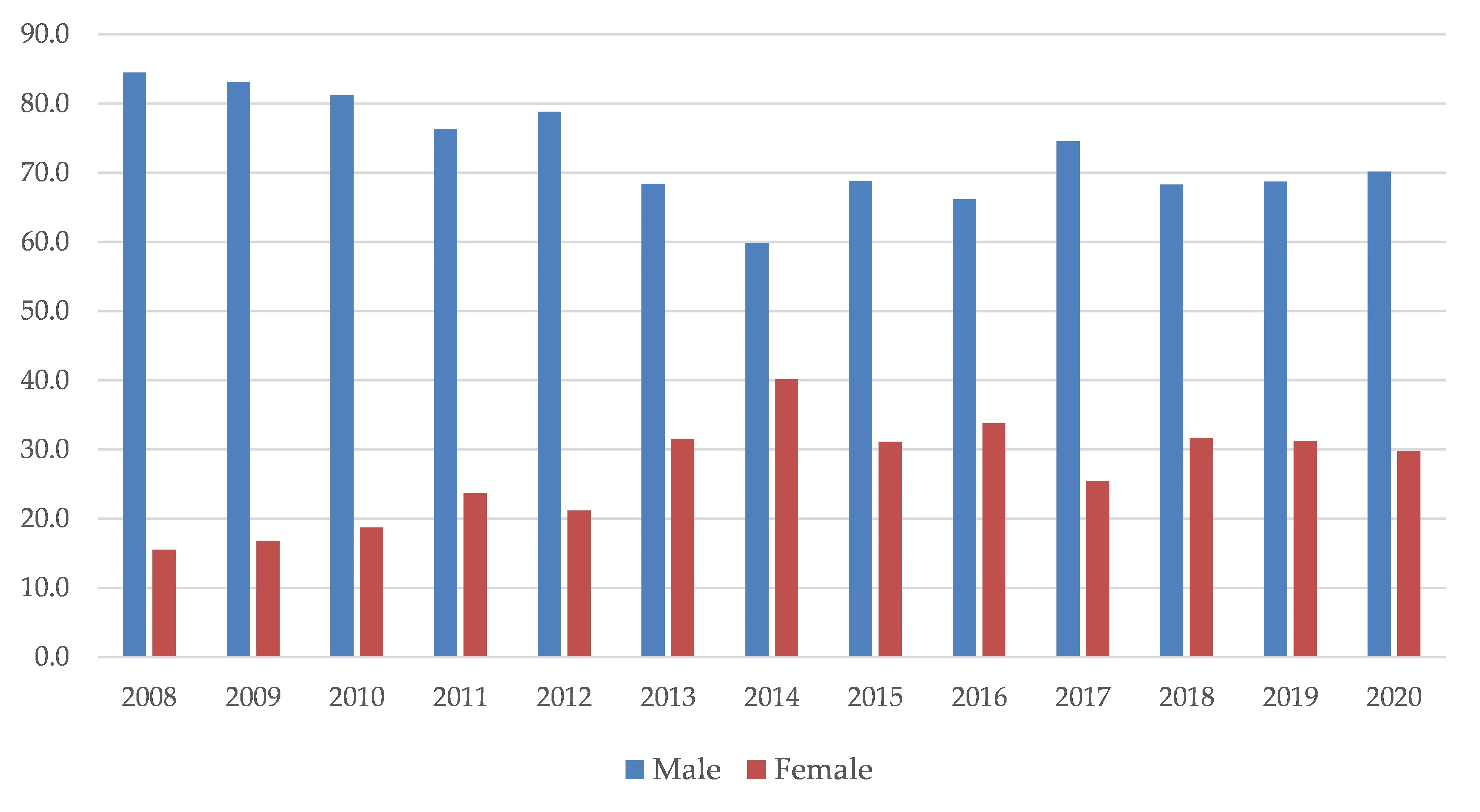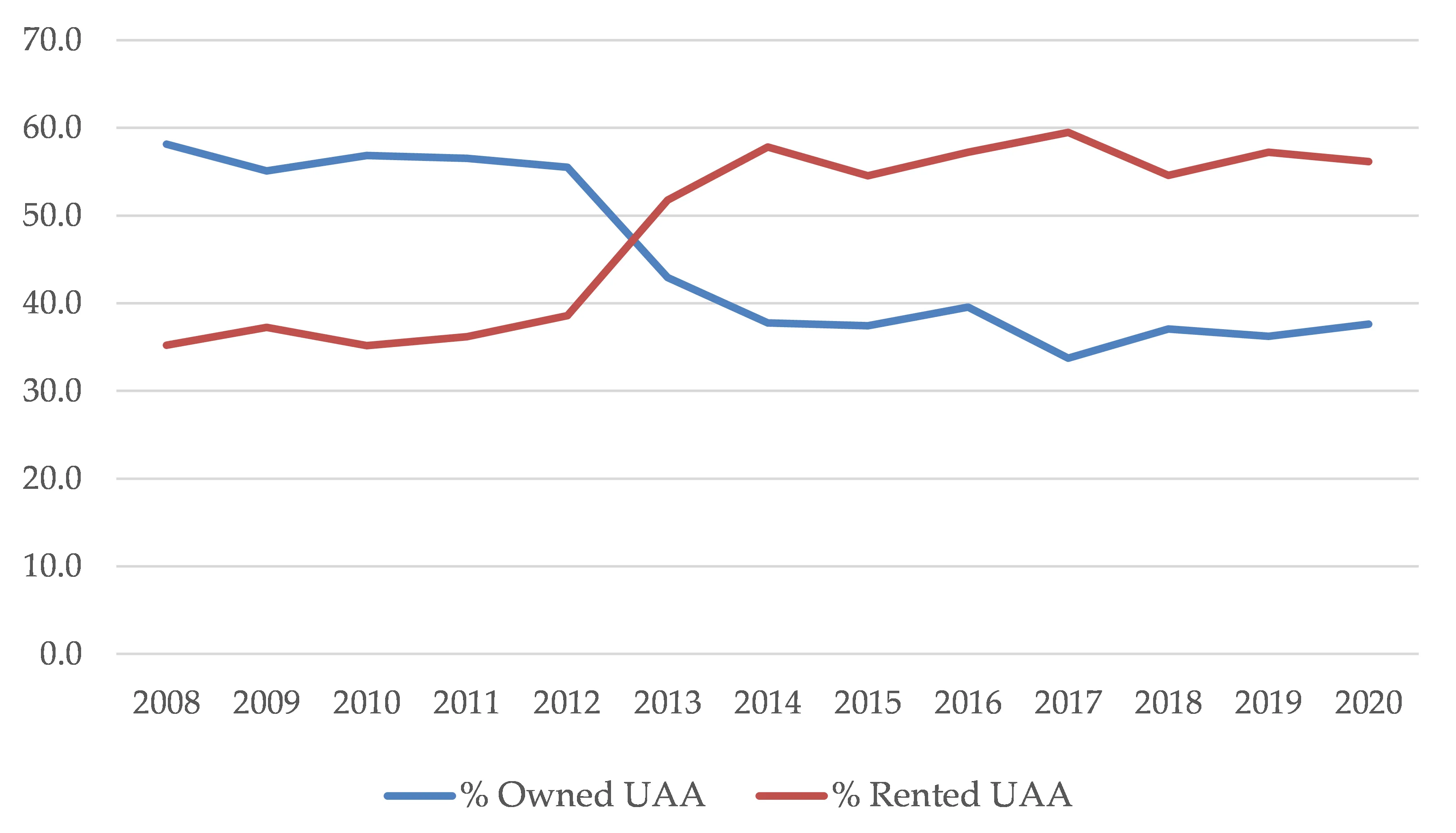 The agricultural sector plays an important role in the metropolitan area of Rome. Recent data has shown that 40% of the municipalities (47 municipalities) record an agricultural extension of over 70% of the territorial area. However, in the last decade, there was a slight decrease in all the main indicators relating to the agricultural sector. Indeed, the Utilized Agricultural Area (UAA) decreased from 75,726 ha to 66,656 ha (−12%), and Livestock Units (LU) recorded a decrease, albeit more limited (−4%), while the added value of agriculture and Gross Salable Production (GSP) experienced a higher decrease (respectively −24% and −14%). From 2010 to 2020, there was also a small decrease in land productivity (−4%) and a consistent fall in terms of working units (−20%), but, on the other hand, there was an increase in labor productivity (+31%).