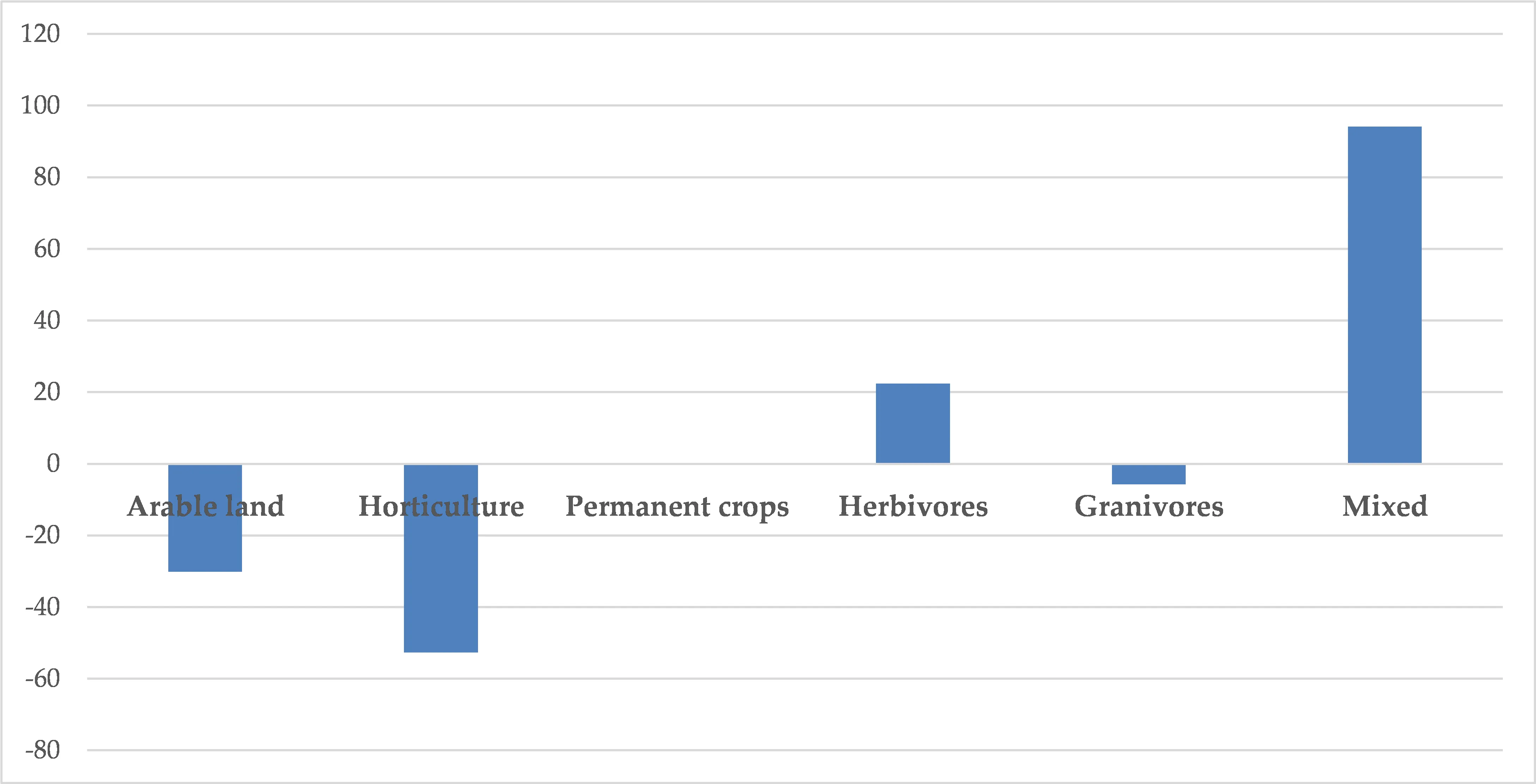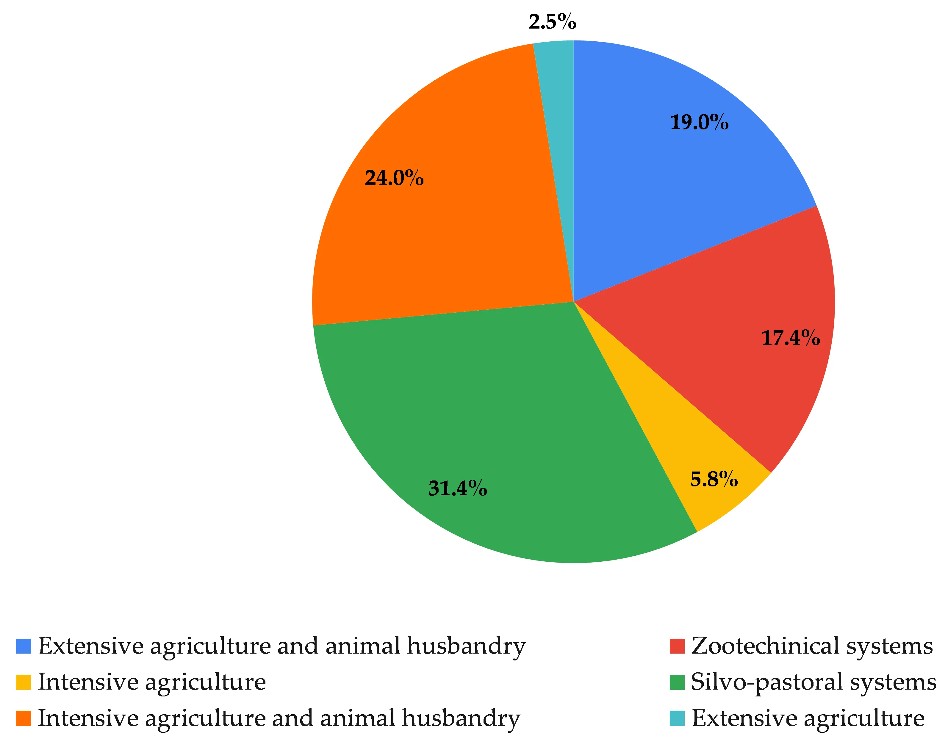 Among production systems (), 31.4% of the municipalities of the metropolitan city of Rome (38) specialize in silvo-pastoral systems, which are mainly located on the area’s borders. Other areas are specialized in intensive agriculture and animal husbandry, and this category represents 24% of the municipalities of the metropolitan city. While only 6% of municipalities specialize exclusively in intensive agriculture, a larger portion of the territory, including the municipality of Rome, specializes in extensive agriculture and animal husbandry, encompassing nearly 20% of municipalities.