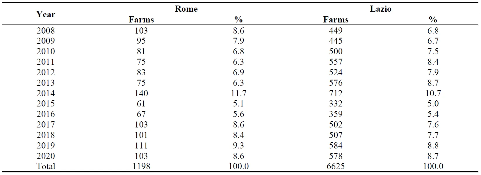 In this framework, we want to analyze which type of farms and agriculture are spreading in the metropolitan area of Rome to verify the changes that have occurred in the structural and socio-economic characteristics of farms and to estimate the variations in farm performance and the economic value of agricultural land. Furthermore, we want to evaluate the impact of public support on the formation of agricultural income and verify if other gainful activities influence the formation of farm revenue and, therefore, whether it contributes to their survival over time.