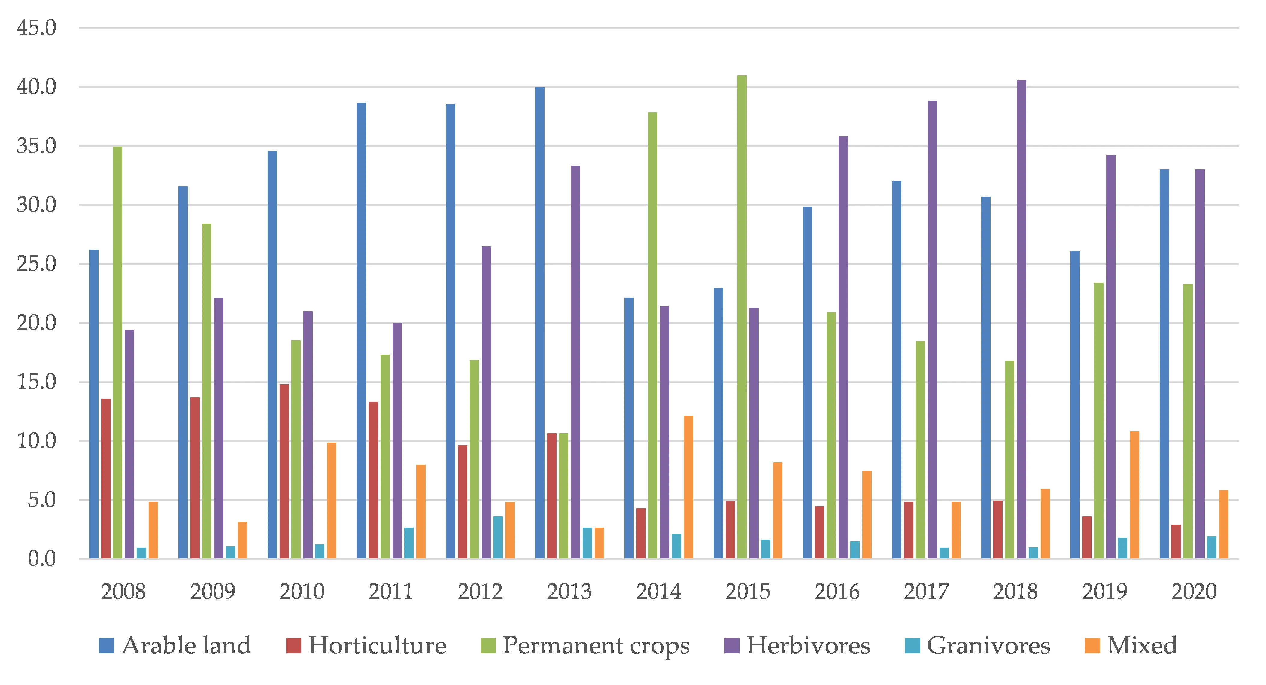 Ascione E, Carillo F, Vagnozzi A (a cura di). Verso la consulenza alla gestione attraverso la RICA. In Creazione di gruppi omogenei di imprese e verifica dei risultati economici; Working paper Rete Rurale Nazionale 2007–2013; Istituto Nazionale di Economia Agraria: Roma, Italia, 2011. Available online: https://rica.crea.gov.it/download.php?id=921 (accessed on 17, August 2024).