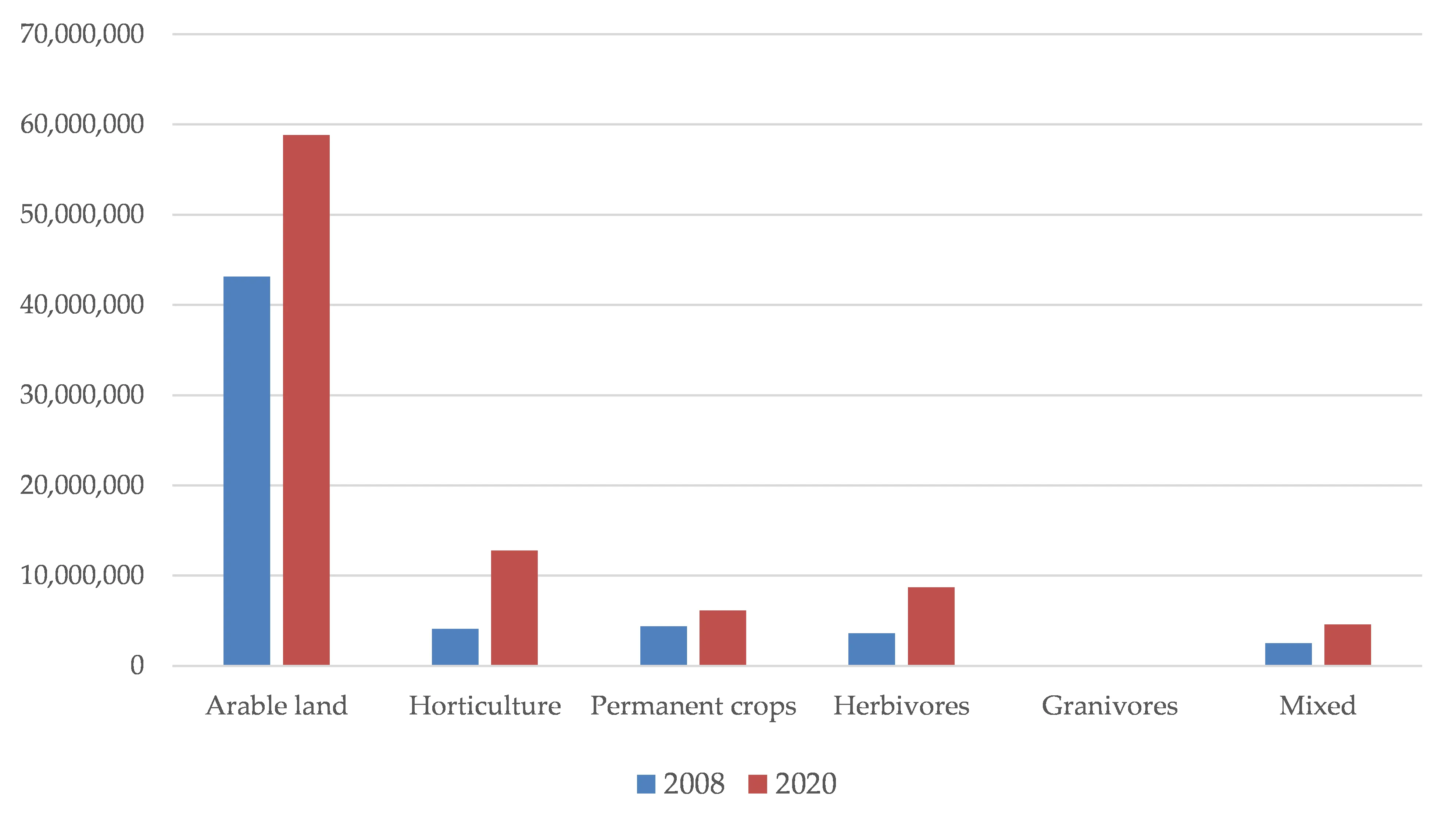 8]. However, in recent years, we have witnessed an intensification of soil degradation processes, particularly the consumption of agricultural land, due to incorrect land management (lack of balance between agricultural areas and built-up areas). By consumption of agricultural land, therefore, we must precisely understand the transition from agricultural and semi-natural roofs to urban ones. However, this contraction has not led to a loss of agricultural production due to the progressive introduction of new production techniques, which increased productivity per hectare and intensified livestock activities [