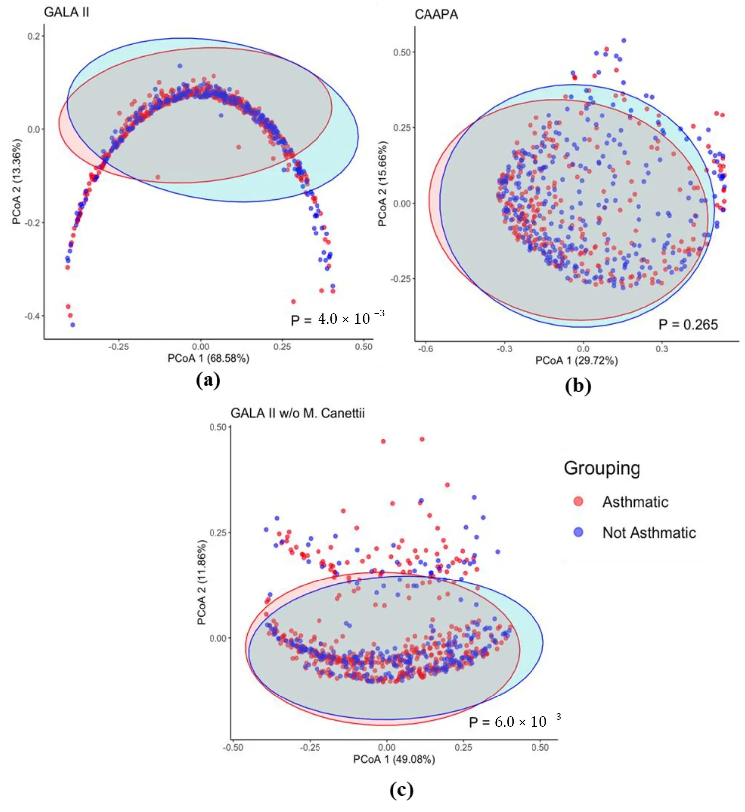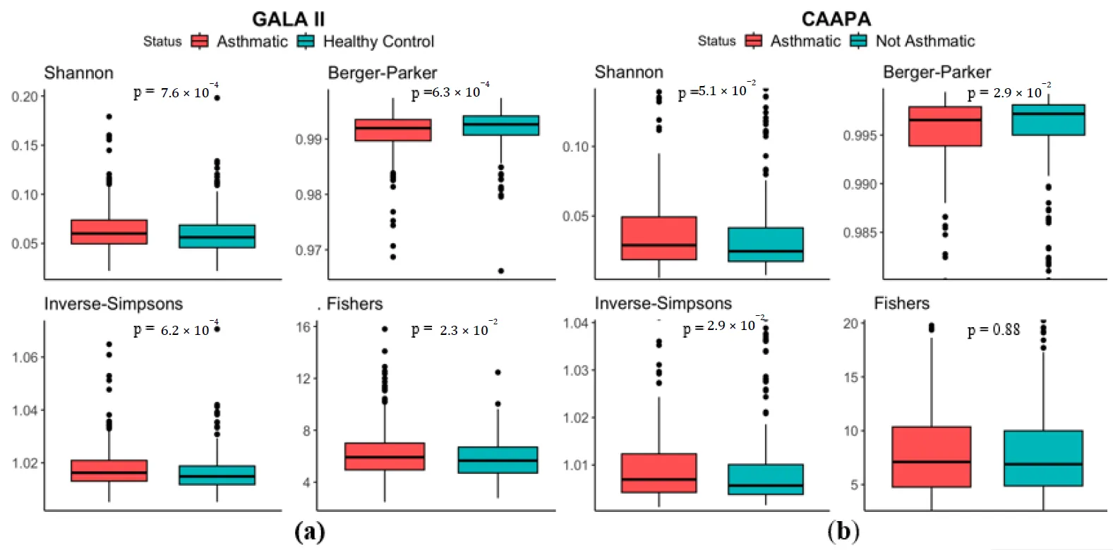 Analysis based on the 694 Hispanic children of the GALA II study showed significant higher Shannon Index (median in asthmatics (