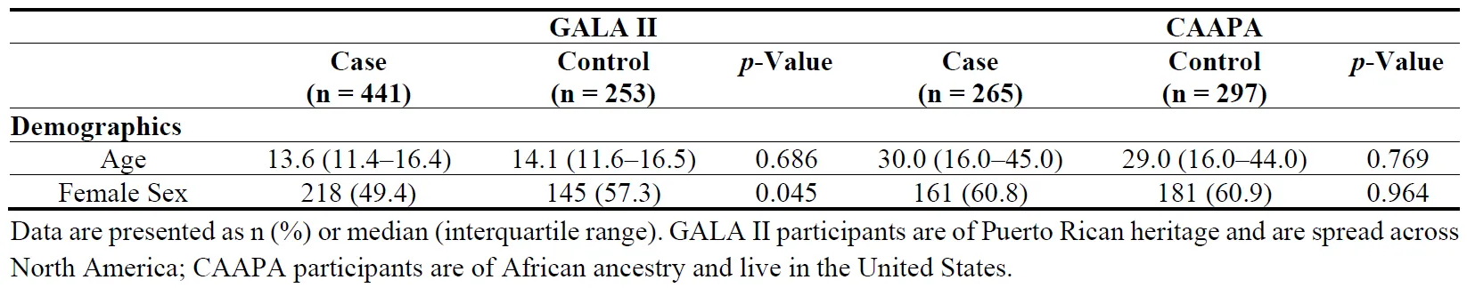 The baseline characteristics of the participants in both the GALA II and CAAPA study are detailed in . The GALA II study had 441 cases and 253 control samples. The median age of the case group was 13.6 years, while the control group had a mean age of 14.1 years. The proportion of females was significantly higher in the control group (57.3%) compared to the case group (49.4%) (
