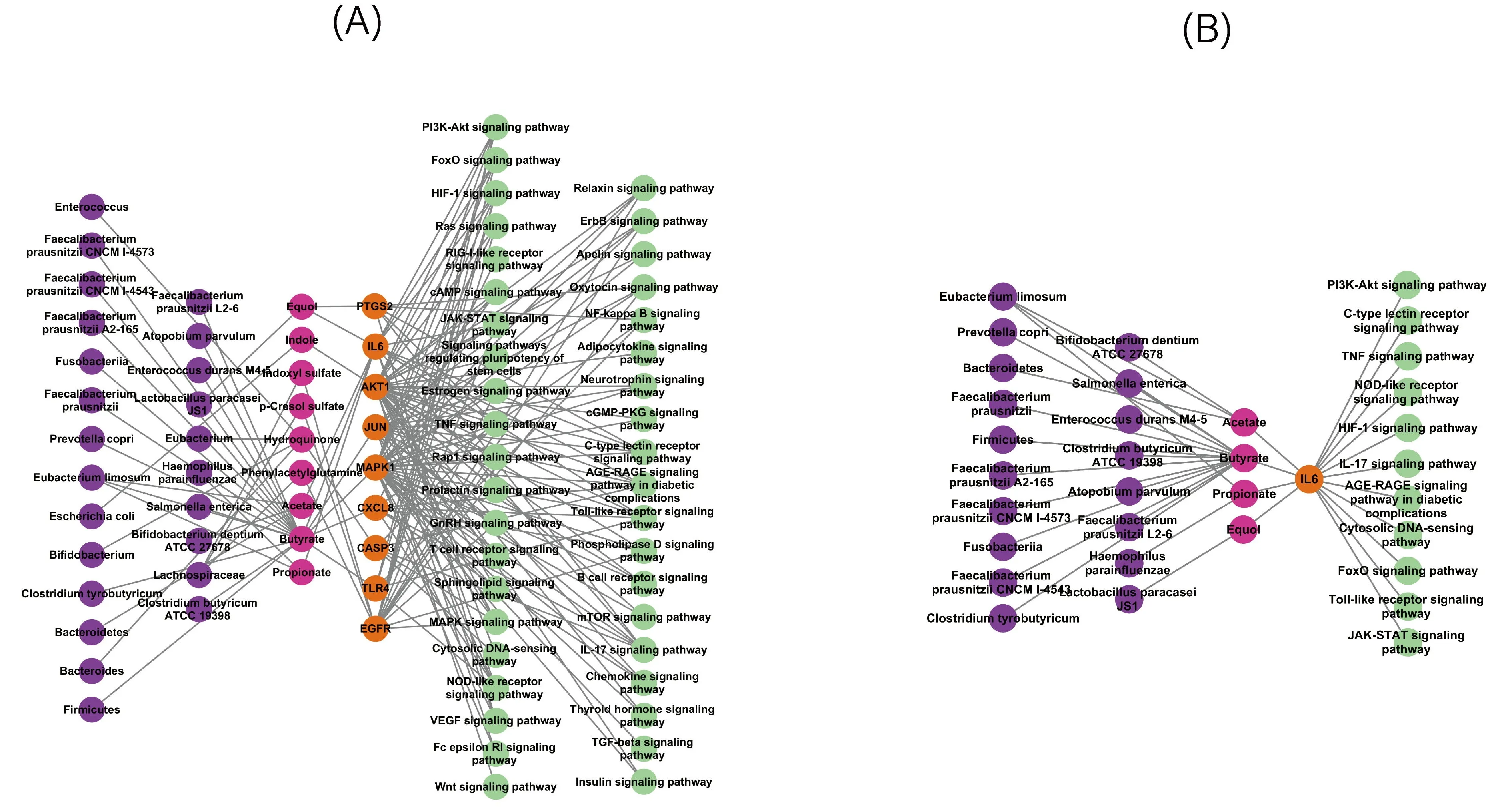 . MMTS network. Purple circle: gut microbiota; Pink circle: metabolitered; Orange circle: target; Green circle: signaling pathway. (<b>A</b>) The overall MMTS network. (<b>B</b>) MMTS network of the core target IL6.