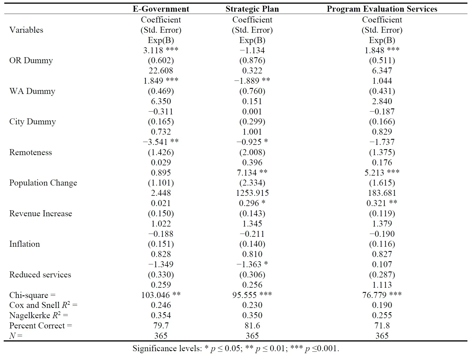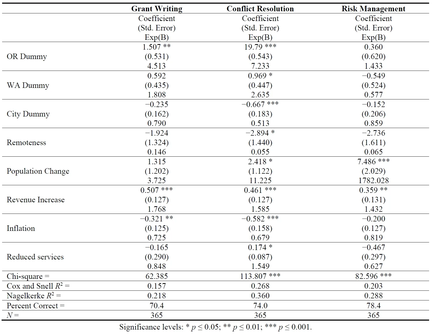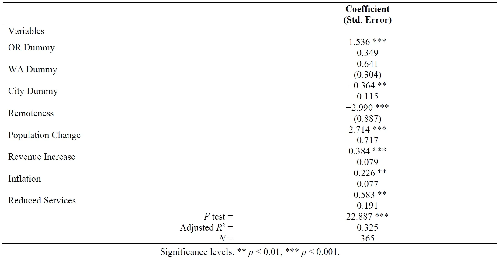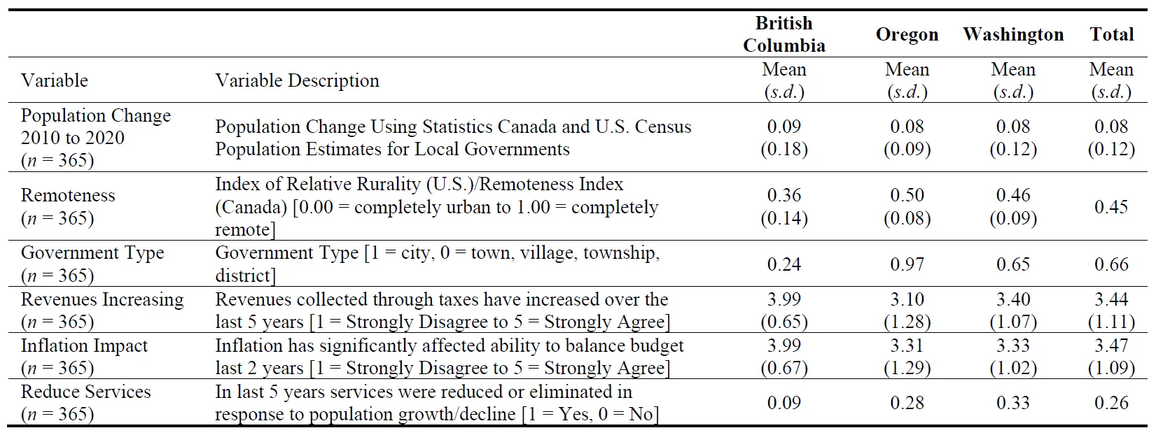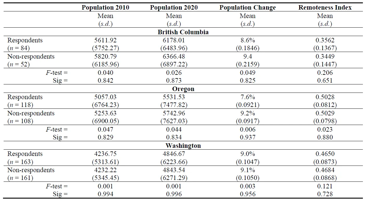 Response rates for the survey are robust. In BC, 136 local governments with populations of 30,000 or less were identified, of which 84 completed the survey (61.8% response rate). In Oregon, 226 cities were surveyed, with 117 completing the survey process (51.8% response rate). In Washington, 324 local governments were sent surveys, with 163 completions (50.1% response rate). displays population data. BC had the largest average population size in 2020 ($$\bar{\mathrm{x}}$$ = 6178.01), ranging from 199 to 28,568. Oregon had the second-largest average size ($$\bar{\mathrm{x}}$$ = 5589.49) with a range of 50 to 29,421, while the average responding city in Washington had 4816.67 residents with a range of 52 to 27,202. Population change between 2010 and 2020 was also calculated for the responding cities, with Washington experiencing the highest average growth at 9%, followed by British Columbia at 8.6%, and Oregon at 7.6%.