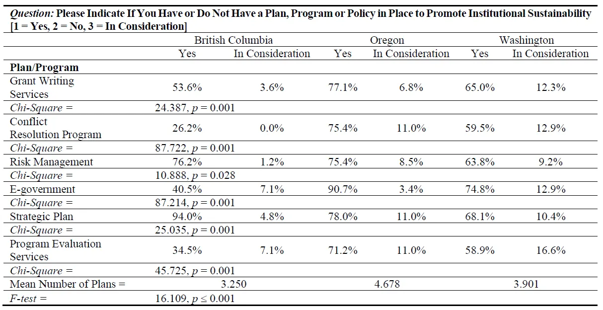 Institutional sustainability is a critical focus for state and provincial governments, particularly in addressing the many challenges faced by rural communities. As noted, these regions often contend with limited resources, geographic isolation, and the need for tailored economic and social development strategies. To support these communities, Oregon, Washington, and BC have each implemented a range of policies and programs aimed at enhancing local institutional sustainability. These initiatives are designed to build local capacity, support infrastructure development, and foster economic resilience, ensuring that rural areas can thrive in the face of ongoing challenges. This section provides a brief overview of key programs, highlighting their objectives, impacts, and the challenges they face in achieving long-term sustainability.