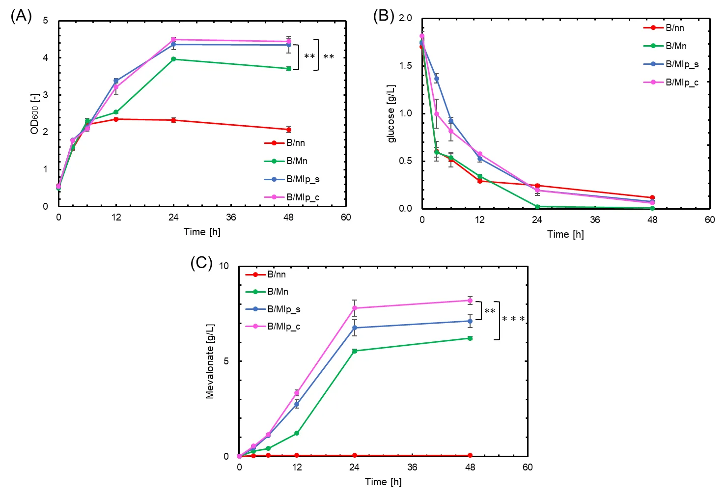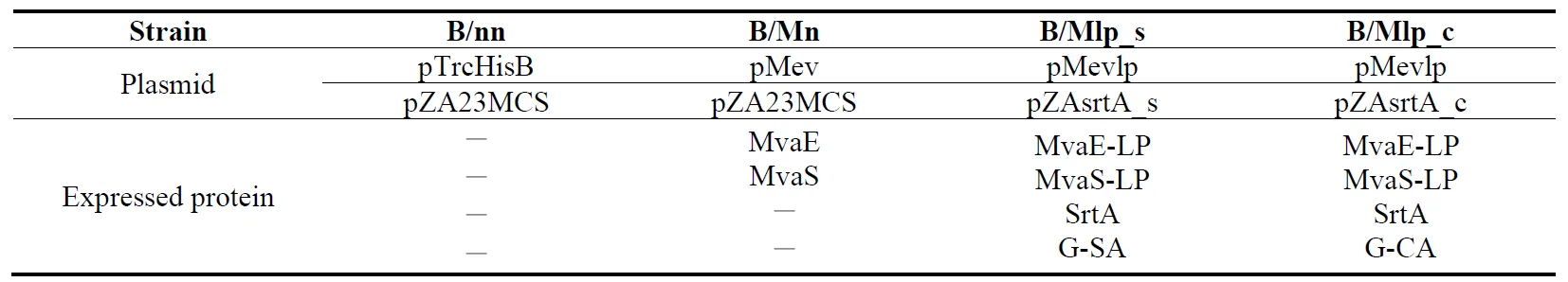 E. coli DH5α as a template. The gene fragments of the vector were amplified using primers 11 and 12 and pZAsrtA as a template. These two gene fragments were ligated, and the resulting plasmid was named pZAsrtA_c. In summary, five strains were constructed as follows: B/nn, which is BW25113 transformed with pTrcHisB and pZA23MCS; B/Mn, which is BW25113 transformed with pMev and pZA23MCS; B/Mlp, which is BW25113 transformed with pMevlp and pZAsrtA; B/Mlp_s, which is BW25113 transformed with pMevlp and pZAsrtA_s; and B/Mlp_c, which is BW25113 transformed with pMevlp and pZAsrtA_c ().