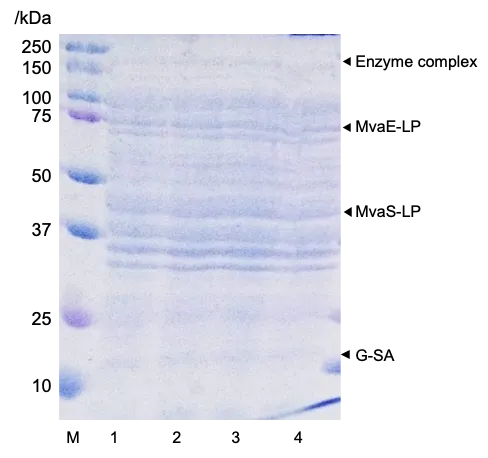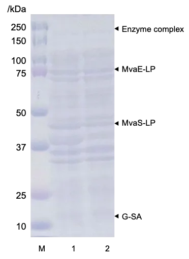 . SDS-PAGE analysis of whole-cell fractions using G-SA scaffold. Lane 1: B/Mn, containing MvaE and MvaS; Lane 2: B/Mlp_s, containing MvaE-LP, MvaS-LP and G-SA.