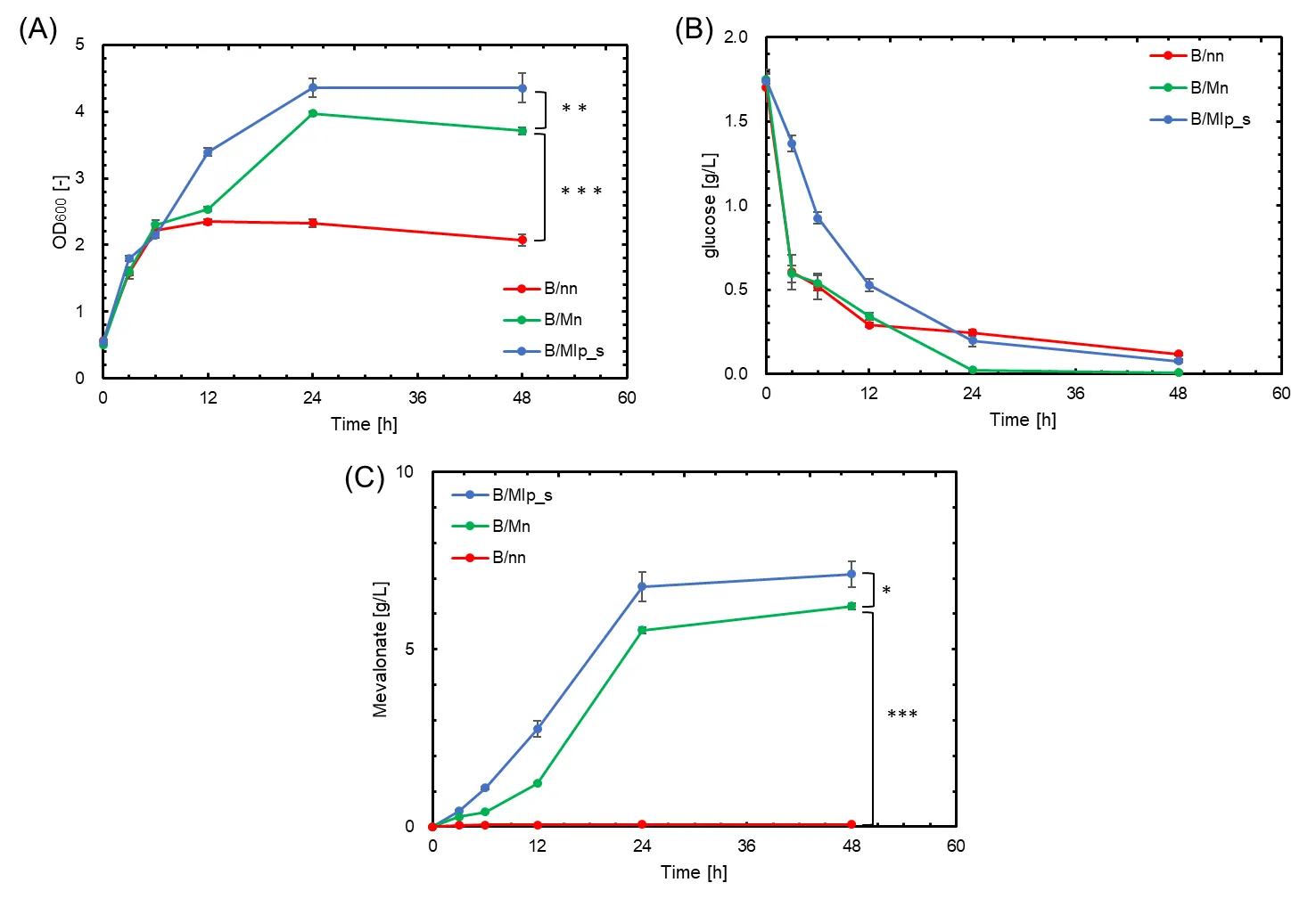 . Growth, glucose consumption, and mevalonate production in strains with and without G-SA and SrtA. Red, green, and blue symbols indicate results for B/nn, B/Mn: containing MvaE and MvaS, and B/Mlp_s: containing MvaE-LP, MvaS-LP and G-SA, respectively. (<b>A</b>) Cell growth (OD<sub>600</sub>); (<b>B</b>) Glucose concentration (g/L); (<b>C</b>) Mevalonate production (g/L). Data are shown as the mean of five independent experiments, each starting from separately isolated colonies, and error bars represent standard deviations. Statistical significance was determined by Student’s <i>t</i>-test (<sup>∗</sup> <i>p</i> < 0.10; <sup>∗∗</sup> <i>p</i> < 0.05; <sup>∗∗∗</sup> <i>p</i> < 0.01).