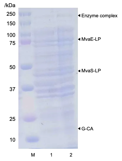 . SDS-PAGE analysis of whole-cell fractions using G-CA scaffold. Lane 1: B/Mn strain, containing MvaE and MvaS-LP; Lane 2: B/Mlp_c, containing MvaE-LP, MvaS-LP and G-CA.