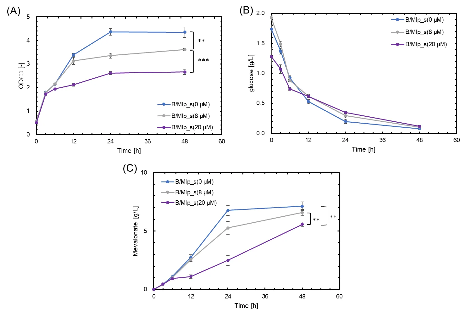 . The effect of biotin concentration on growth, glucose consumption, and mevalonate production in B/Mlp_s, containing MvaE-LP, MvaS-LP and G-CA. Blue, gray, and purple symbols indicate results with 0, 8, and 20 µM biotin, respectively. (<b>A</b>) Cell growth (OD<sub>600</sub>); (<b>B</b>) Glucose concentration (g/L); (<b>C</b>) Mevalonate production (g/L). Data are shown as the mean of five independent experiments, each starting from separately isolated colonies, and error bars represent standard deviations. Statistical significance was determined by Student’s <i>t</i>-test (<sup>∗∗</sup> <i>p</i> < 0.05; <sup>∗∗∗</sup> <i>p</i> < 0.01).