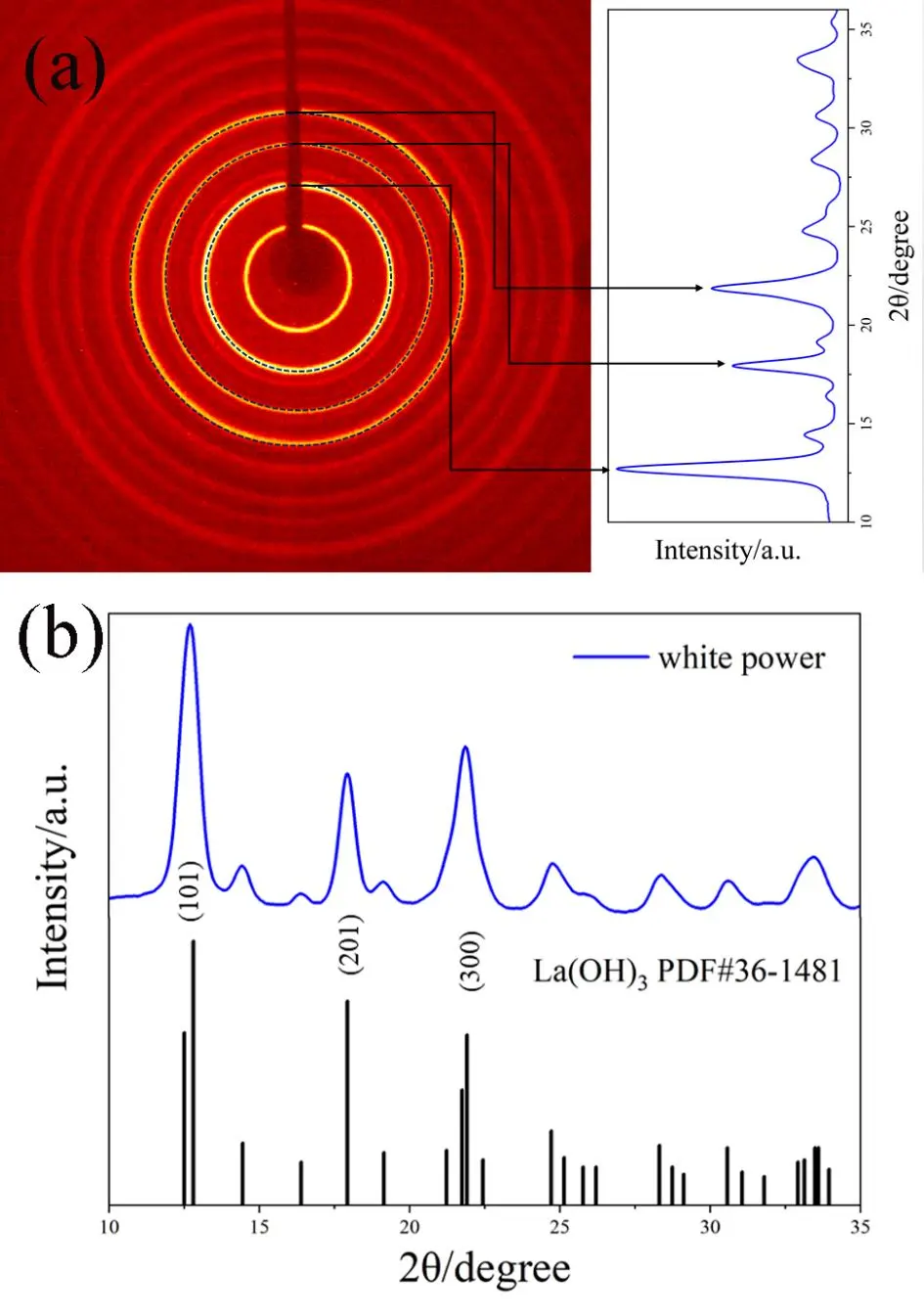 The diffraction peaks were obtained by integrating the Debye rings and compared with the available La(OH)