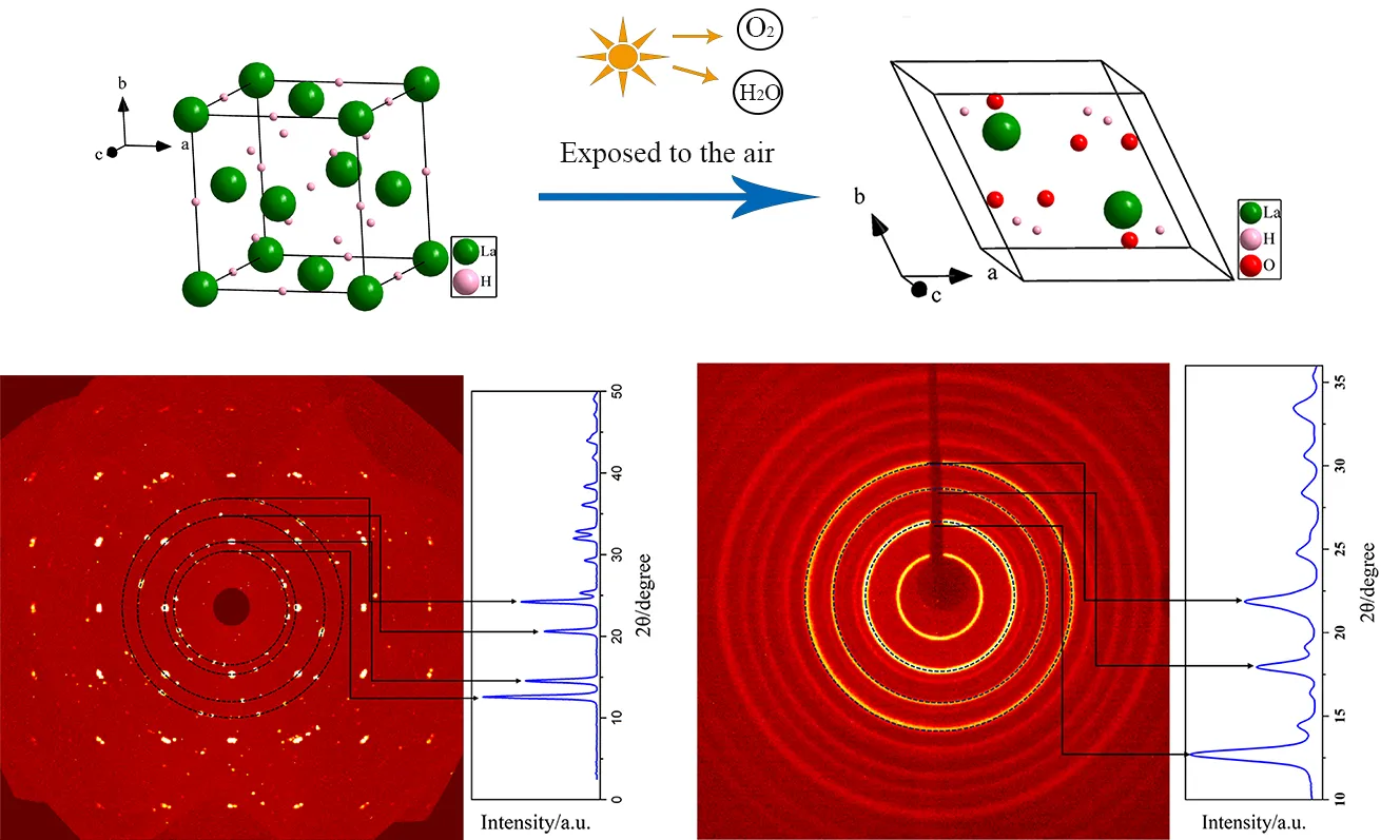 The fragment of lanthanum hydride used for SXRD diffraction was selected from the factory product as is (more than 99.5% purity, Jiangxi Province,China ,zhongxi Metal Materials Co., Ltd., particle size of 100–200 mesh). The lanthanum hydroxide material used for simulated powder X-ray diffraction (PXRD) measurements was the reaction product after the lanthanum hydride material was exposed to the air for 24 h. During the SXRD measurements, lanthanum hydride was placed on a clean glass sheet, washed the surface impurities with anhydrous ethanol and fixed on a thin glass fiber with glue and mounted on the sample stage. All the SXRD measurements were performed using a four-circle single-crystal X-ray diffractometer (Bruker D8 Venture, Bruker AXS GmbH, Karlsruhe, Germany). The hydron detection was carried out with the hydrogen test tape (DX-2106H, Beijing, China,Nitto), with the detected concentrations as low as 1%.