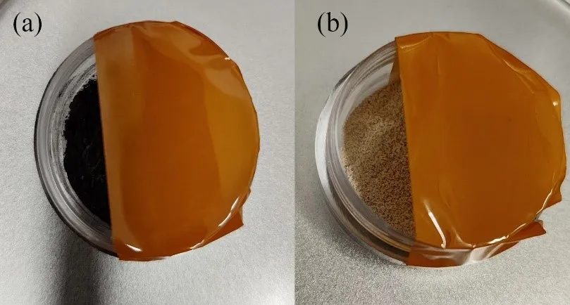 In order to discriminate the most suitable reaction route, first-principles calculations have been used to calculate the formation enthalpy of these three reaction routes, as shown in . Since reaction route 2 has a positive formation enthalpy, it was initially excluded. For the other two reaction routes, route 1 seems more suitable than route 3. However, the possibility of reaction route 3 cannot be excluded extensively. Therefore, a simple hydrogen detection method was designed using special hydrogen detection tape, as shown in . The concept is that the tape will change from amber to black if hydrogen gas is produced during reaction route 3, while the container remains partially open to allow oxygen to participate in the reaction. During our experiment, within 48 h, the tape color remained the original color, as shown in . Therefore, the reaction route 3 has also been excluded.