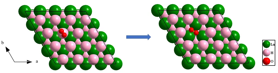 First is the top position of adsorption configuration; after adsorption, O–O bond length increases, tend to have a dissociation and oxygen molecules adsorbed on the surface LaH