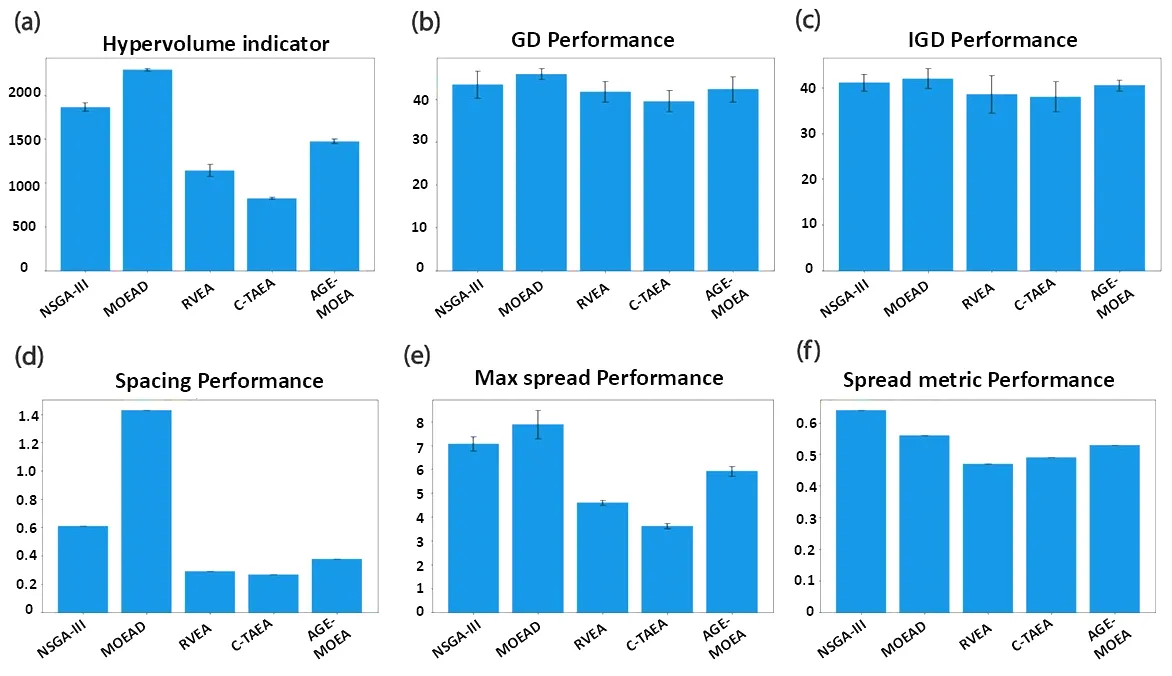 Firstly, the hypervolume (Hv) metric serves as a fundamental measure reflecting the spread and diversity of solutions in the Pareto front. Notably, MOEA/D demonstrated the highest Hv value, indicating its ability to generate well-distributed solutions along the Pareto front. Conversely, RVEA and C-TAEA exhibited lower Hv scores, suggesting potential limitations in maintaining diversity within their solution sets. Next, the generational distance (GD) metric evaluates the convergence of solutions to the true Pareto front. NSGA-III and MOEAD outperformed other algorithms in minimizing GD, indicating superior convergence capabilities. However, AGE-MOEA showcased a slightly higher GD, suggesting a trade-off between convergence and diversity. The inverted generational distance (IGD) metric provides insights into the quality of solutions concerning the true Pareto front. Remarkably, MOEA/D achieved the lowest IGD score, highlighting its ability to produce solutions that are closer to the Pareto front. Conversely, RVEA and C-TAEA exhibited relatively higher IGD values, indicating potential challenges in achieving optimal solutions.