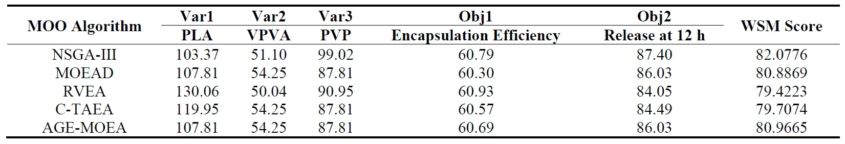 In this analysis, the performance of various MOO algorithms in balancing formulation quality was explored to achieve high encapsulation efficiency and drug release within 12 h. presents a comparison of MOO algorithms across different formulation factors (Var1 to Var3) and their corresponding objective values, along with their WSM scores. Formulation quality is crucial in pharmaceutical and encapsulation applications. Var1 to Var3 represent various formulation parameters, including PLA, V-PVA, and PVP, which are crucial for determining the characteristics of the encapsulation system. The selection of these variables significantly impacts the encapsulation efficiency and drug release properties, ultimately influencing the effectiveness of the delivery system.