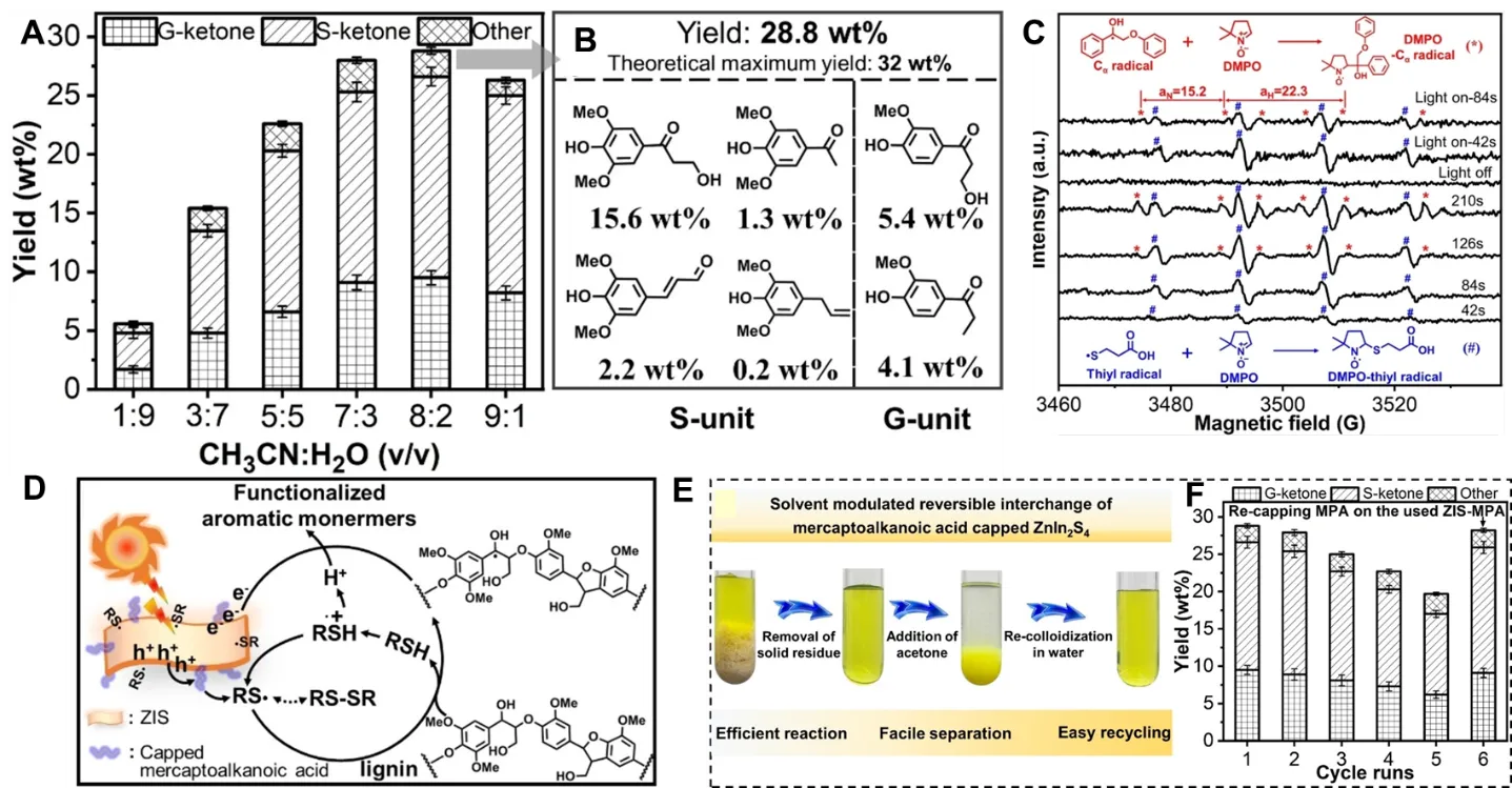 . Performance and mechanism analysis of ultrathin ZnIn<sub>2</sub>S<sub>4</sub> microbelts with mercaptoalkanoic acid as ligand for efficient depolymerization of native lignin under visible light. <b>(A</b>) Visible light-induced depolymerization of natural lignin from birch flour on ZIS-MPA using various solvent ratios. (<b>B</b>) The process was conducted in a mixed solvent of CH<sub>3</sub>CN and H<sub>2</sub>O (<i>v</i>/<i>v</i> = 8:2) to yield functionalized aromatic monomers. (<b>C</b>) Time-correlated DMPO spin-trapping ESR spectra for the system comprising ZIS-MPA and PP-ol under alternating light-on/off conditions. (<b>D</b>) Suggested mechanism for the photoinduced depolymerization of natural lignin on ZIS-MPA. (<b>E</b>) Images displaying the reversible exchange of ZIS-MPA mediated by the solvent during the reaction. (<b>F</b>) Repeated cycles of the photoinduced depolymerization of natural lignin on ZIS-MPA.