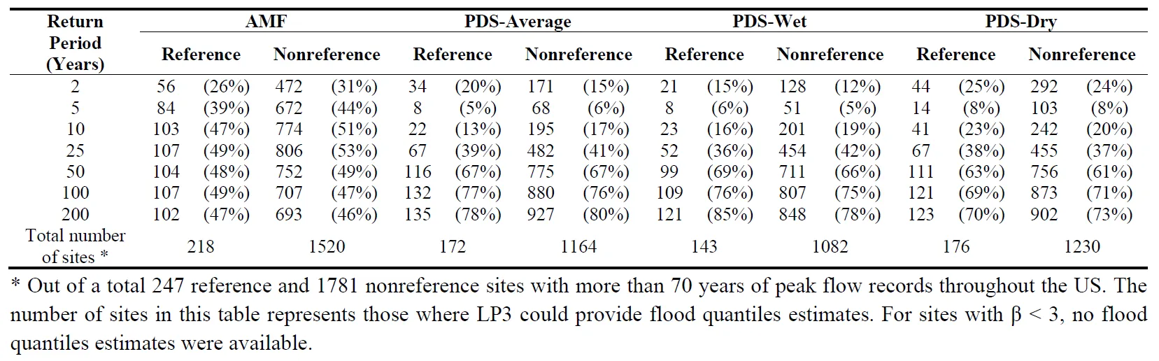 In this study, we tested whether using PDS instead of AMF data could improve flood frequency estimates, depending on the region. With a warmer and wetter climate projected for the 21st century, high-flow events within a single wet year may exceed the AMF of a dry year. By combining AMF with multiple independent flood events each year, we may achieve better flood quantile estimates. Since floods during average, wet, and dry years can have different causes, creating separate PDS for these years could further enhance estimates for both frequent and rare flood events. To test our hypothesis, specifically, we: (1) developed separate PDS datasets for average, wet, and dry years using daily streamflow data; (2) evaluated the performance of the LP3 distribution when applied to PDS of wet and dry years, in comparison to AMF; and (3) examined differences in flood estimation between reference (undisturbed) and nonreference (disturbed) sites.