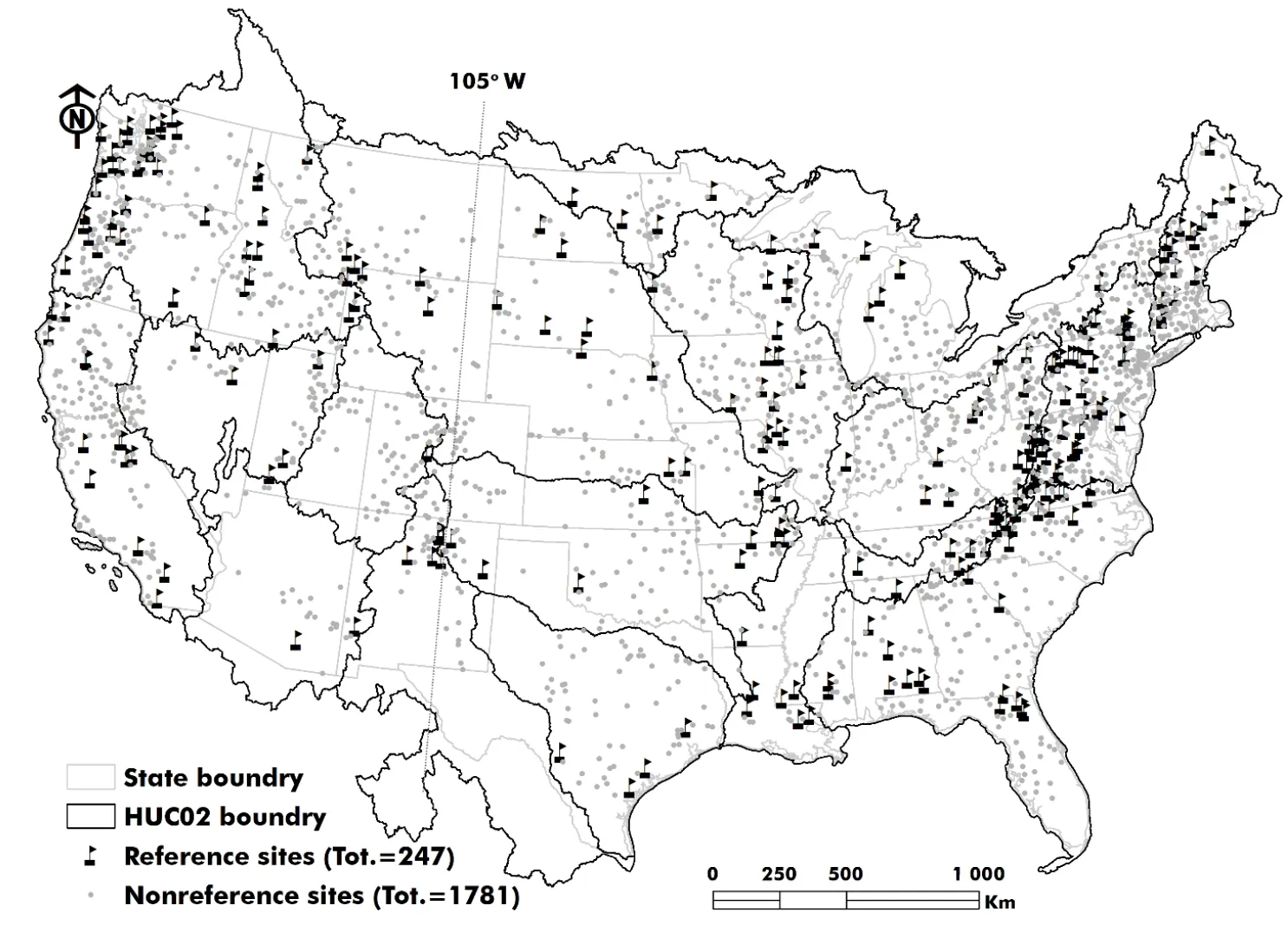 42]. According to HCDN information, 247 streamflow gaging stations were classified as reference sites, while 1781 were classified as nonreference sites.