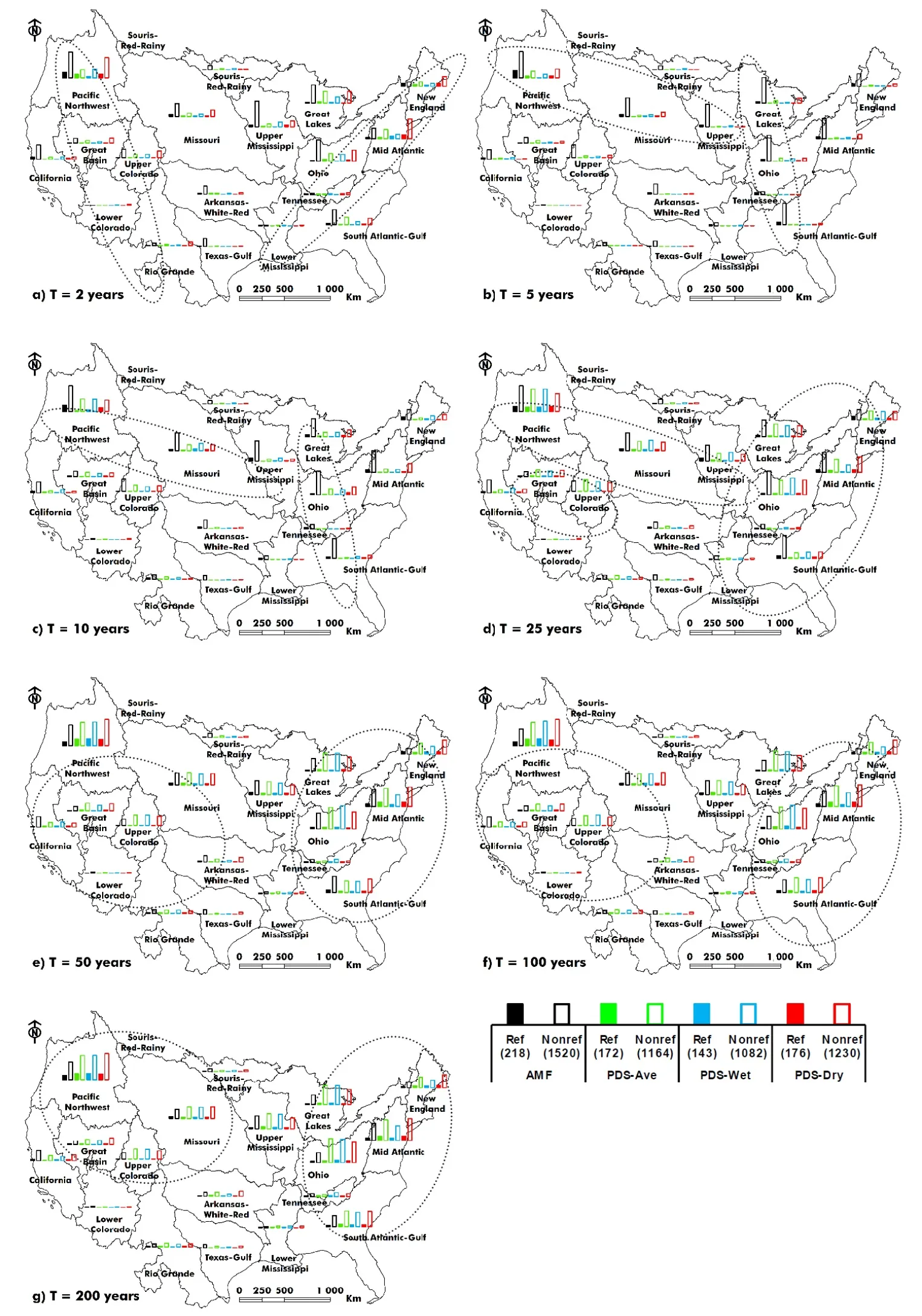 The results are presented for floods with return periods of 2, 5, 10, 25, 50, 100, and 200 years. We focus on sites where flood quantile estimates are reliable, indicated by an observed-to-estimated flood ratio (R < 1) when fitting LP3 to AMF or PDS for average, wet, or dry years. This ratio is further discussed in the next section. The patterns are analyzed within the HUC02 water resources regions [