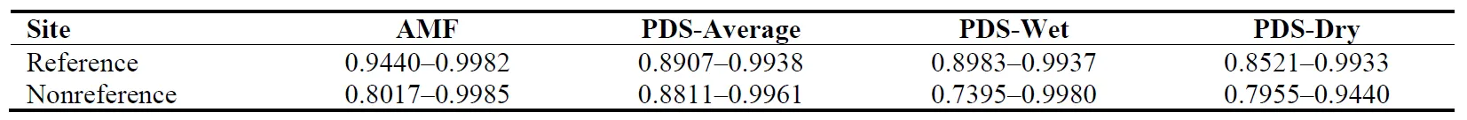 When LP3 was fitted to AMF and dry PDS data, 24–31% of reference and nonreference sites across the US provided reliable the 2-year flood estimates (R < 1, ). For average and wet PDS, only 12–20% of sites had R < 1. Two regions—the west (Rio Grande, Lower Colorado, Great Basin, and Pacific Northwest) and the east (Lower Mississippi, Tennessee, Mid-Atlantic, and New England)—had more sites with R < 1 when LP3 was fitted to dry PDS (a). It suggests that frequent 2-year floods may be better represented by low peak flows from dry year records. Investigating the link between atmospheric circulation patterns and streamflow variations in dry years could help clarify the mechanisms generating high-frequency floods in these regions [