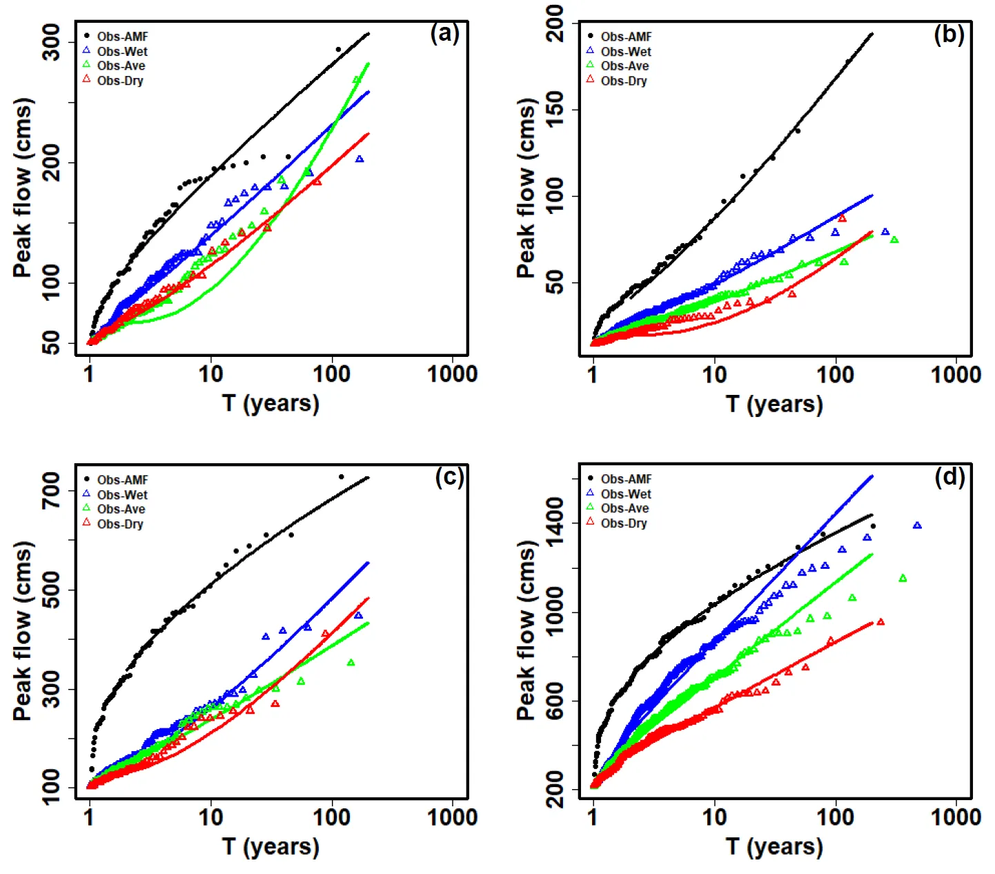Although PDS is typically assumed to vary by wet, average, and dry years, we found that the largest flood could occur in any of these conditions. For instance, in a, the PDS for average years stays above those for wet and dry years as the return period increases. In b, a 100-year flood in the PDS for dry years remains higher than that of wet and average years. In c, as return periods increase, the PDS for dry years is higher than for average years but lower than for wet years. d shows the PDS for wet years exceeding those for both average and dry years.