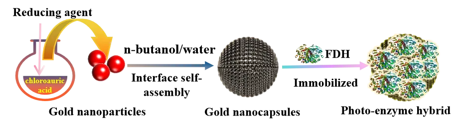 The schematic diagram of the preparation of gold nanoparticles, gold nanocapsules, and the immobilization of formate dehydrogenase (FDH) to construct the photo-enzyme hybrid system is shown in Scheme 1.