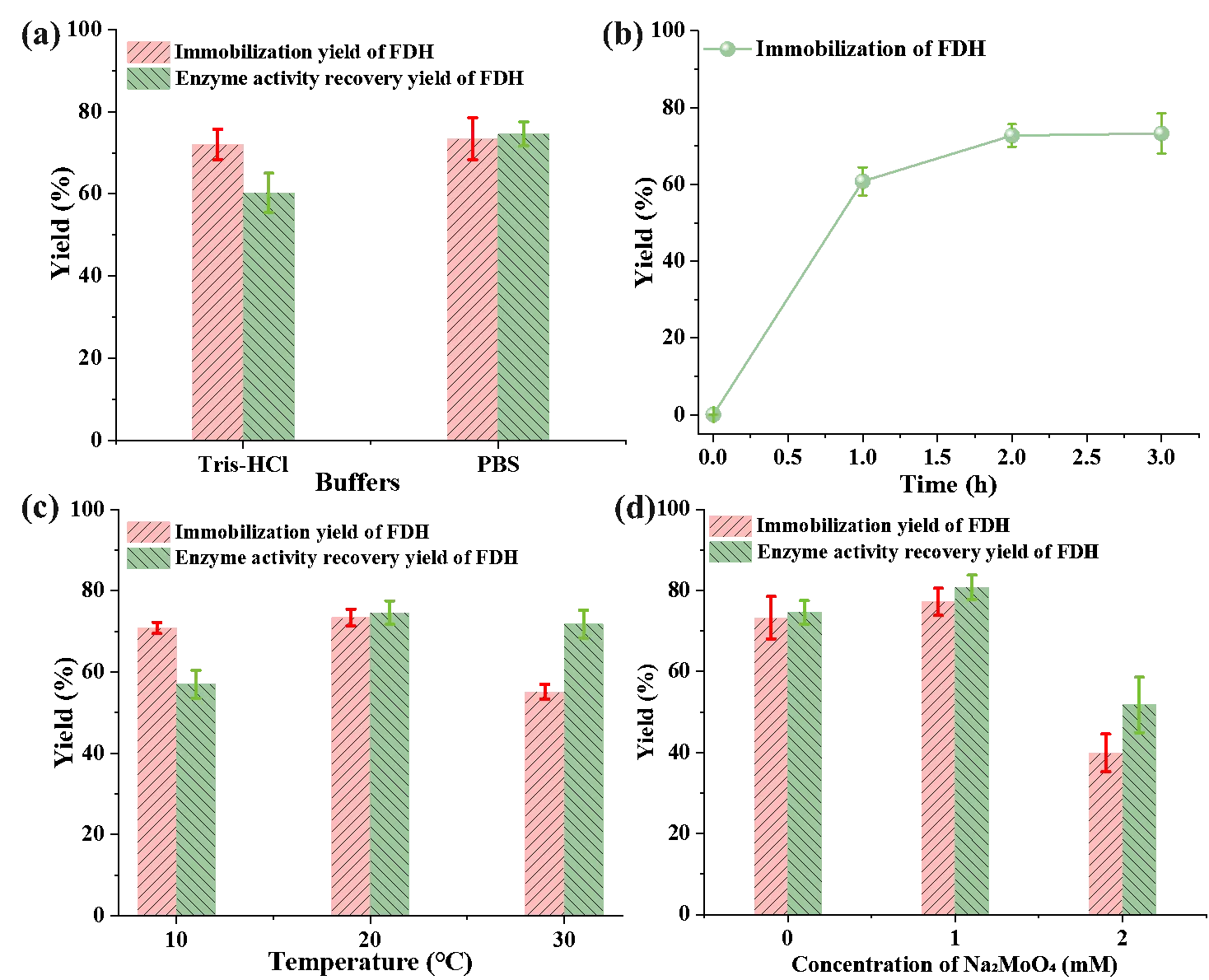 The FDH (0.10 mg/mL) was mixed with Au NCPs (1.50 mg/mL) in a buffer solution (100 mM, pH = 7.40) and shaken the mixture at a set temperature for a certain period. The protein concentration in the supernatant was measured using the Bradford assay, and the immobilization yield of FDH was calculated (Equation (2)). The photo-enzyme hybrid system was centrifuged at 8000 rpm for 5 minutes, and the precipitate was collected and washed twice with a buffer solution. Then, freeze-dry the precipitate and store it at 4 °C for future use. The activity of FDH was assessed by measuring the initial reduction rates of formate catalyzed by both free FDH and the photo-enzyme hybrid [