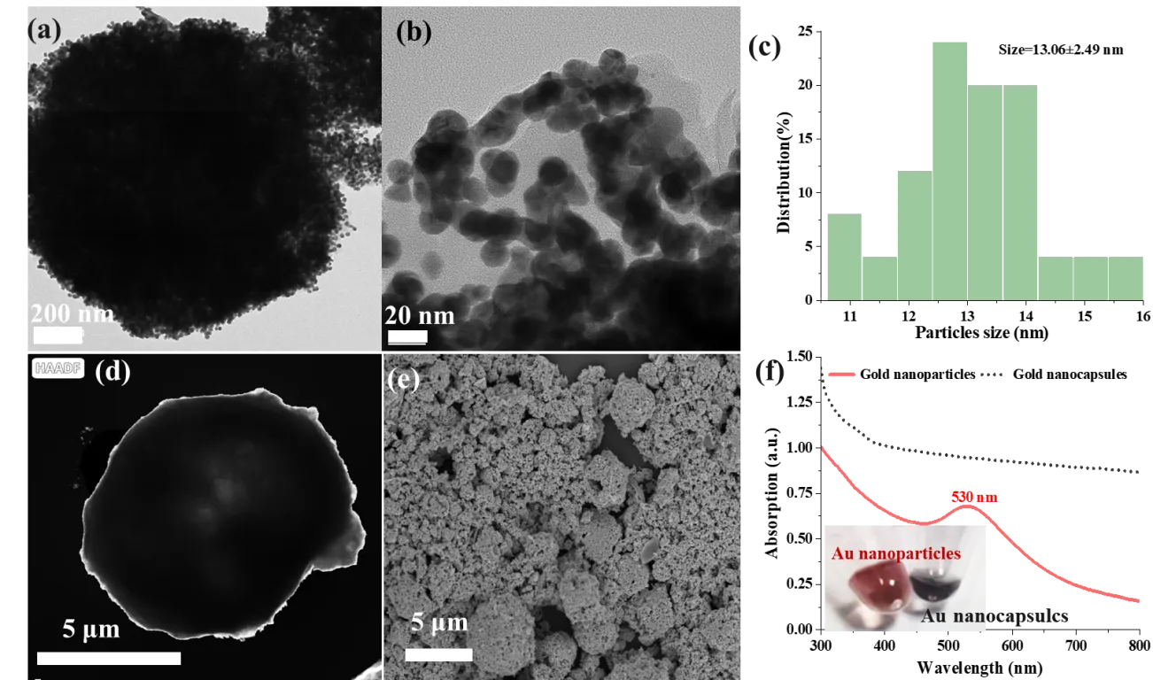 . (<b>a</b>) Transmission electron microscopy (TEM) images of gold nanocapsules (Au NCPs); (<b>b</b>) TEM images of gold nanoparticles (Au NPs) assembled into Au NCPs; (<b>c</b>) Particle size distribution of Au NPs; (<b>d</b>) HAADF-STEM images of Au NCPs; (<b>e</b>) Scanning electron micrographs (SEM) of Au NCPs; (<b>f</b>) UV-vis absorption spectra of Au NCPs and Au NPs, the inset is a physical image of Au NPs and Au NCPs.