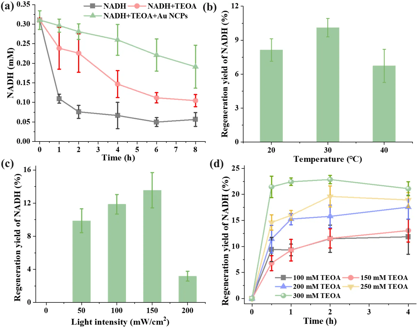 Then, using TEOA as an electron donor, we examined the performance of temperature on the photocatalytic regeneration of NADH by Au NCPs. As shown in b, the photocatalytic regeneration yield of NADH by Au NCPs initially increased and then decreased with rising temperature. The highest regeneration yield of NADH was observed at a reaction temperature of 30 °C, where the NADH regeneration rate reached 10.10%. Since we did not add exogenous electron mediators, such as [Cp