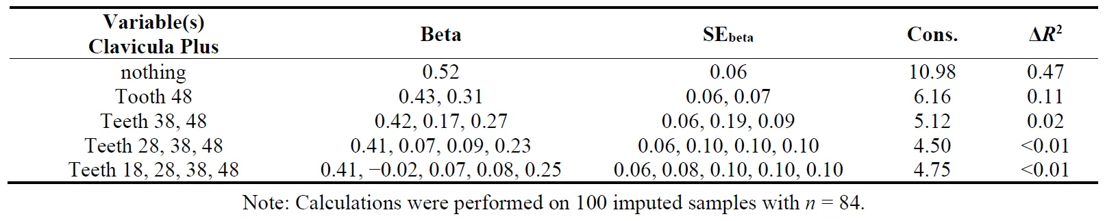 A total of five indicators were examined to predict the estimated age: development of the clavicula coded according to Wittschieber et al. (2014) and mineralization of the four wisdom teeth coded according to Demirjian’s method. Ordinary Least Square regression analyses were performed for each indicator separately due to missing data on various indicators, e.g., if a certain tooth was not available. Unstandardized regression coefficients with standard errors were reported, including the adjusted explained variance of the estimated age (R²). 95% confidence intervals were reported. Finally, the predictive value of taking more than one possible age indicator into a model simultaneously was examined. Due to missing data on the clavicula developmental stage and some teeth, multiple imputations had to be performed. Only the 84 cases having an age estimation were included in this part of the statistic (Hardt et al., 2012). A total of 100 datasets were imputed using the MICE algorithm with predictive mean matching (van Buuren et al., 2011). Statistical analyses were performed by STATA 17 (STATACorp, College Station, TX, USA, 2021), R², after multiple imputations by the package mibeta, using an algorithm described by Hare (2009).