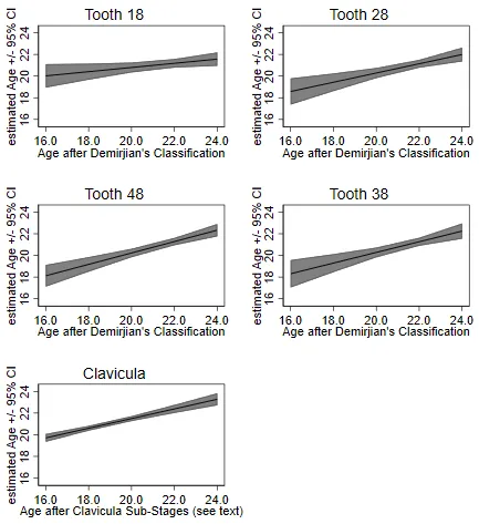 - Combining only the lower wisdom teeth with the clavicle leads to a more precise result in the overall age estimation.