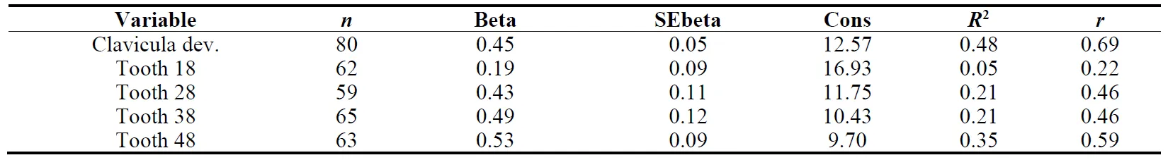 . Linear prediction of age when utilizing clavicula development stage and mineralization of several teeth combined.