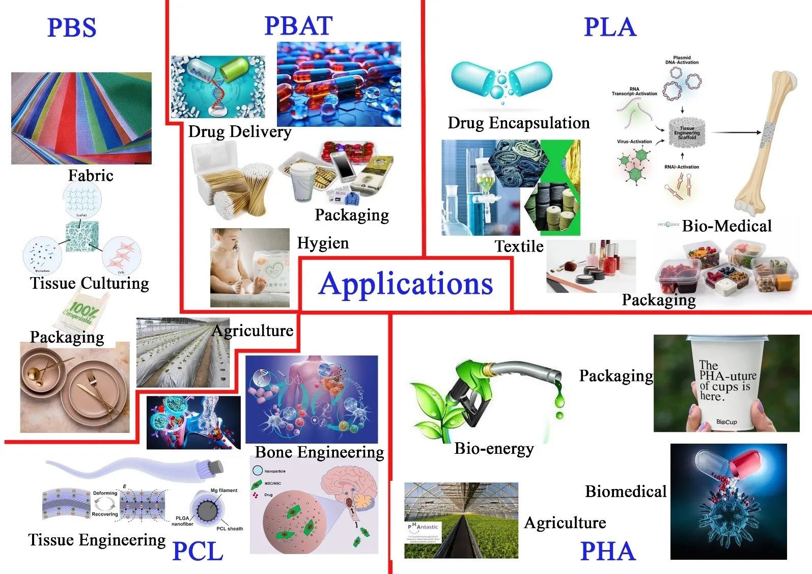 PBAT and its composites are currently and potentially applied to a wide range of applications, owing to their biodegradability, flexibility, and compatibility with existing processing methods. In packaging, PBAT is particularly promising: Starch PBAT blends are used in shopping bags such as those used in Chinese supermarkets, compostable bags that degrade within organic waste, and for food packaging, where PBAT composites and even composites with torrefied coffee grounds can increase thermal and moisture resistance [