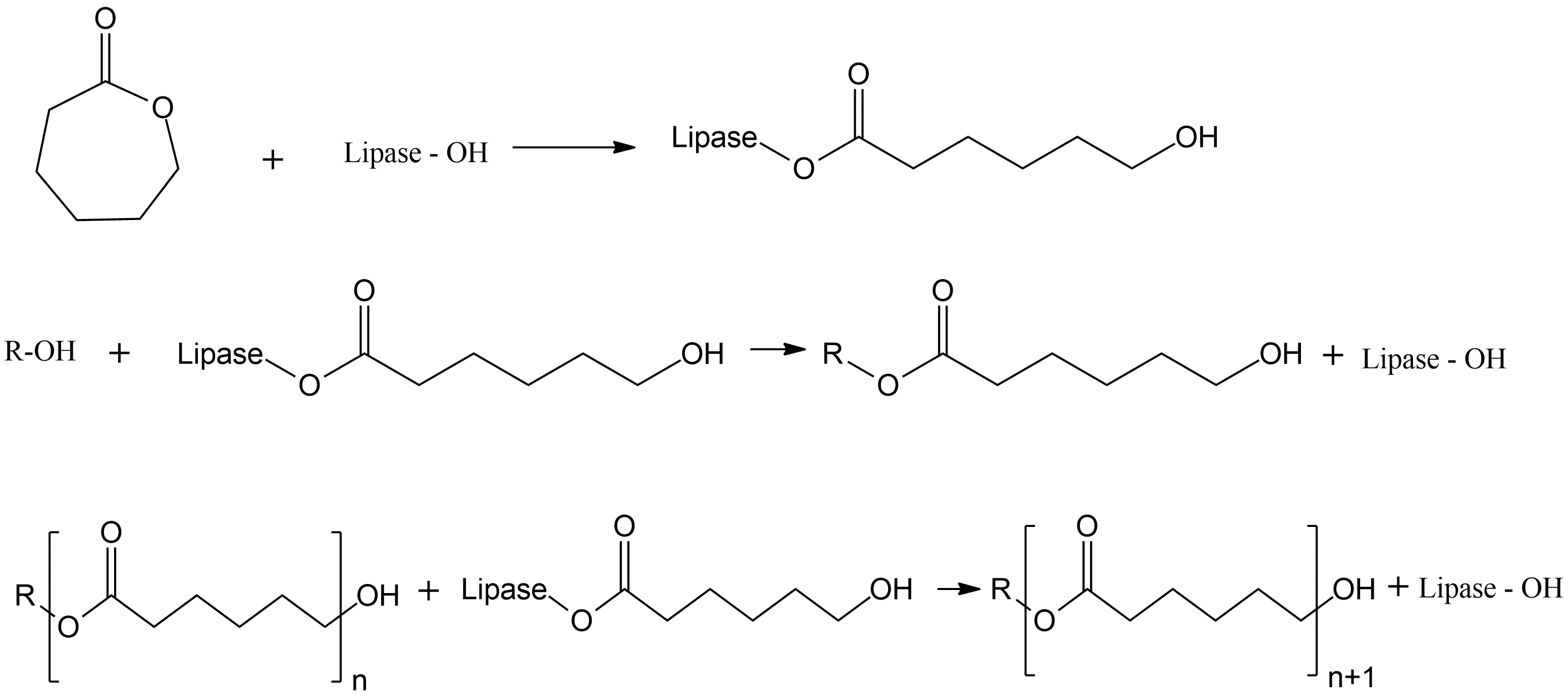 Instead of using metal-based catalysts, enzymes can be used as an alternative. Nobes, G.A., et al., MacDonald, R.T., et al., Kobayashi, S., et al., 2001, and Kobayashi, S., 1999, have proposed a mechanism for the enzymatic ring-opening polymerization (eROP) of ε-caprolactone (ε-CL) using lipases [