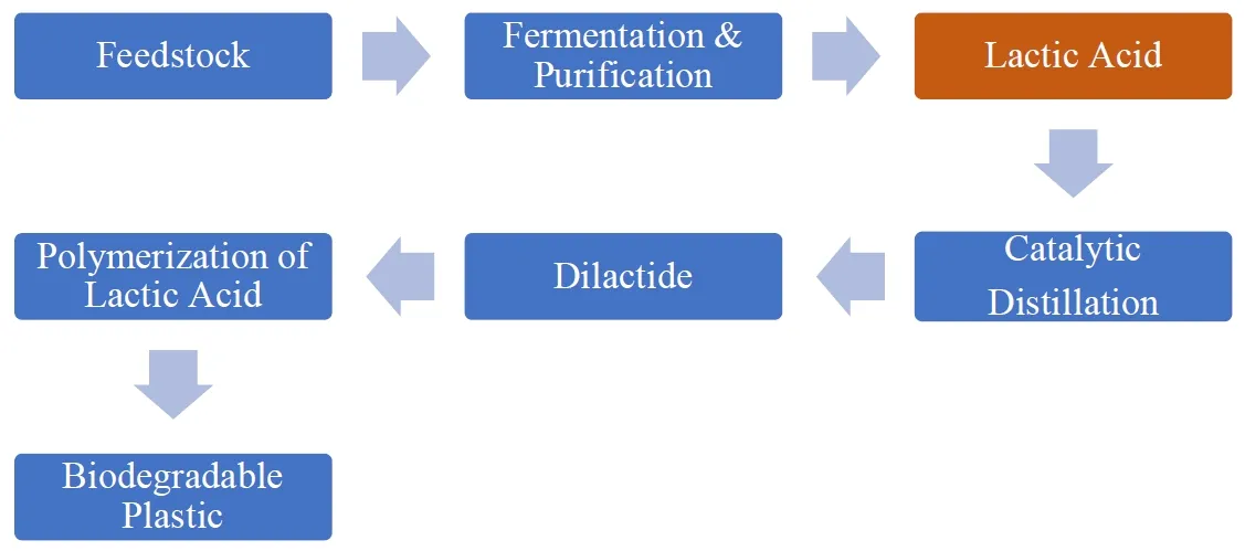 . Polymerization process of the Lactic acid synthesized through fermentation.