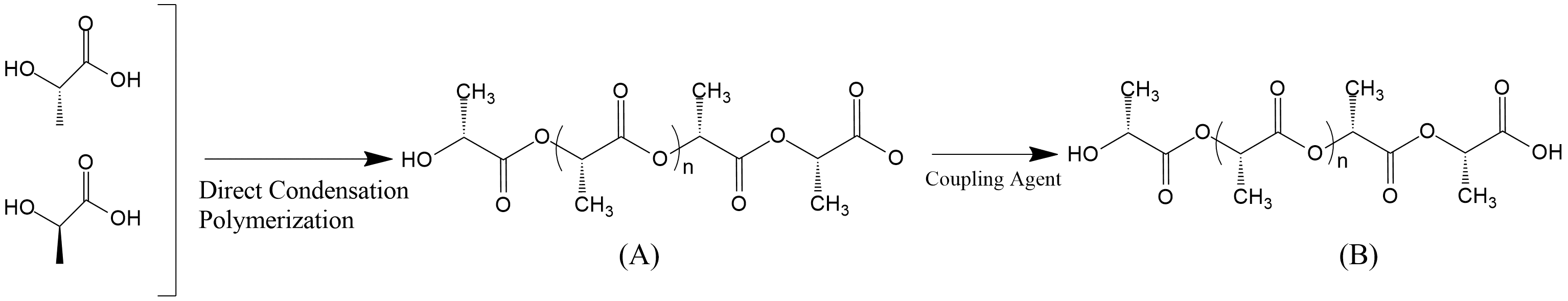 . Polymerization of Lactic acid Through Direct Condensation Polymerization (<b>A</b>) Low MW PLA (<b>B</b>) High MW PLA.