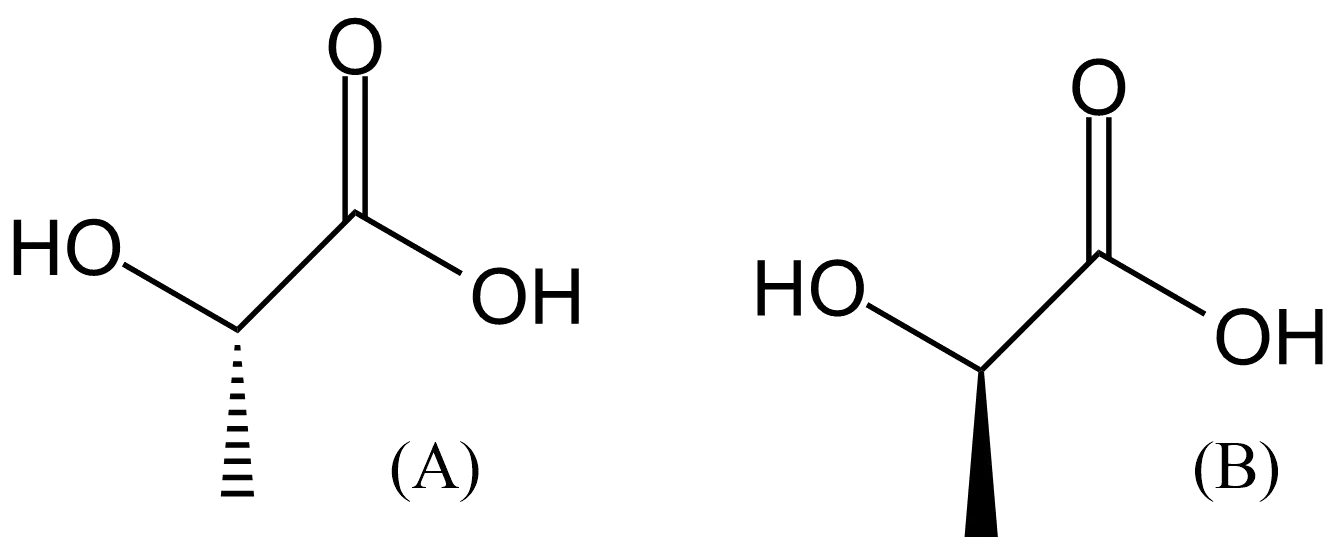 . Structures of (<b>A</b>) l-lactic acid (<b>B</b>) d-lactic acid.