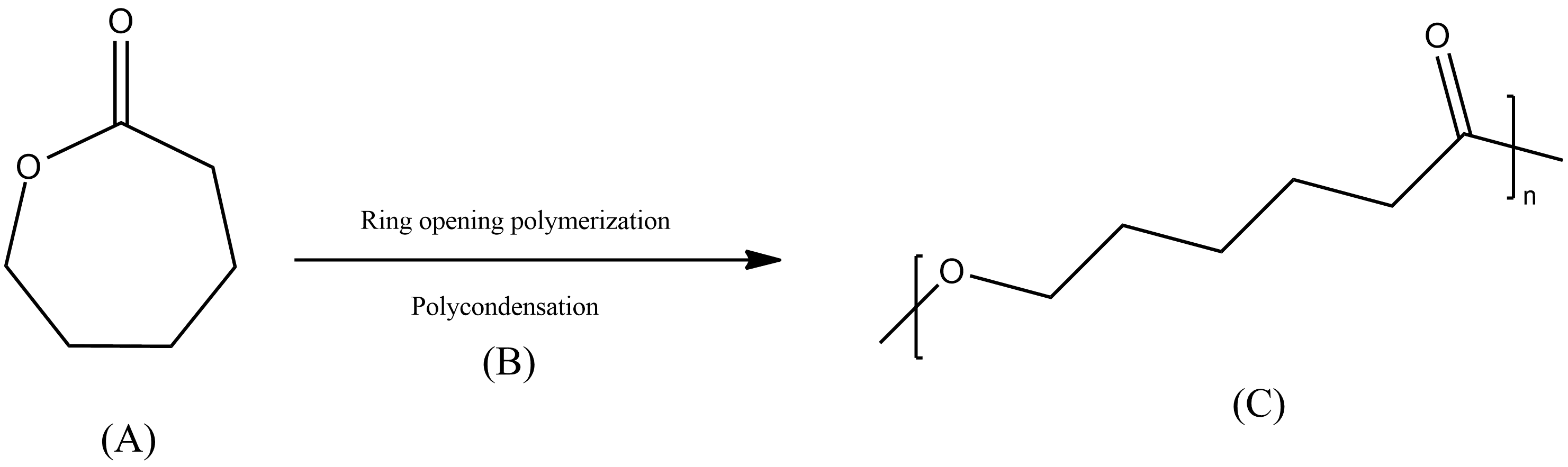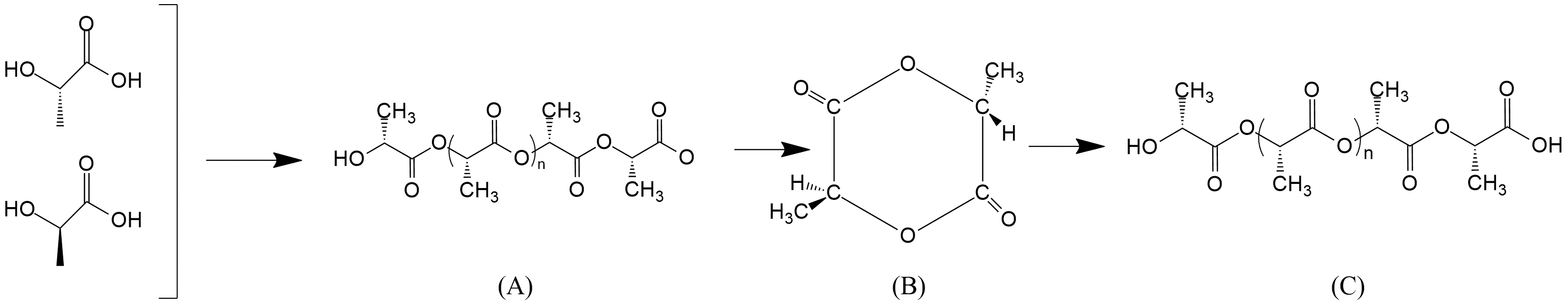 . Polymerization of Lactic Acid Through Ring Opening Polymerization (<b>A</b>) PLA Oligomer (<b>B</b>) Lactide (<b>C</b>) High MW-PLA.