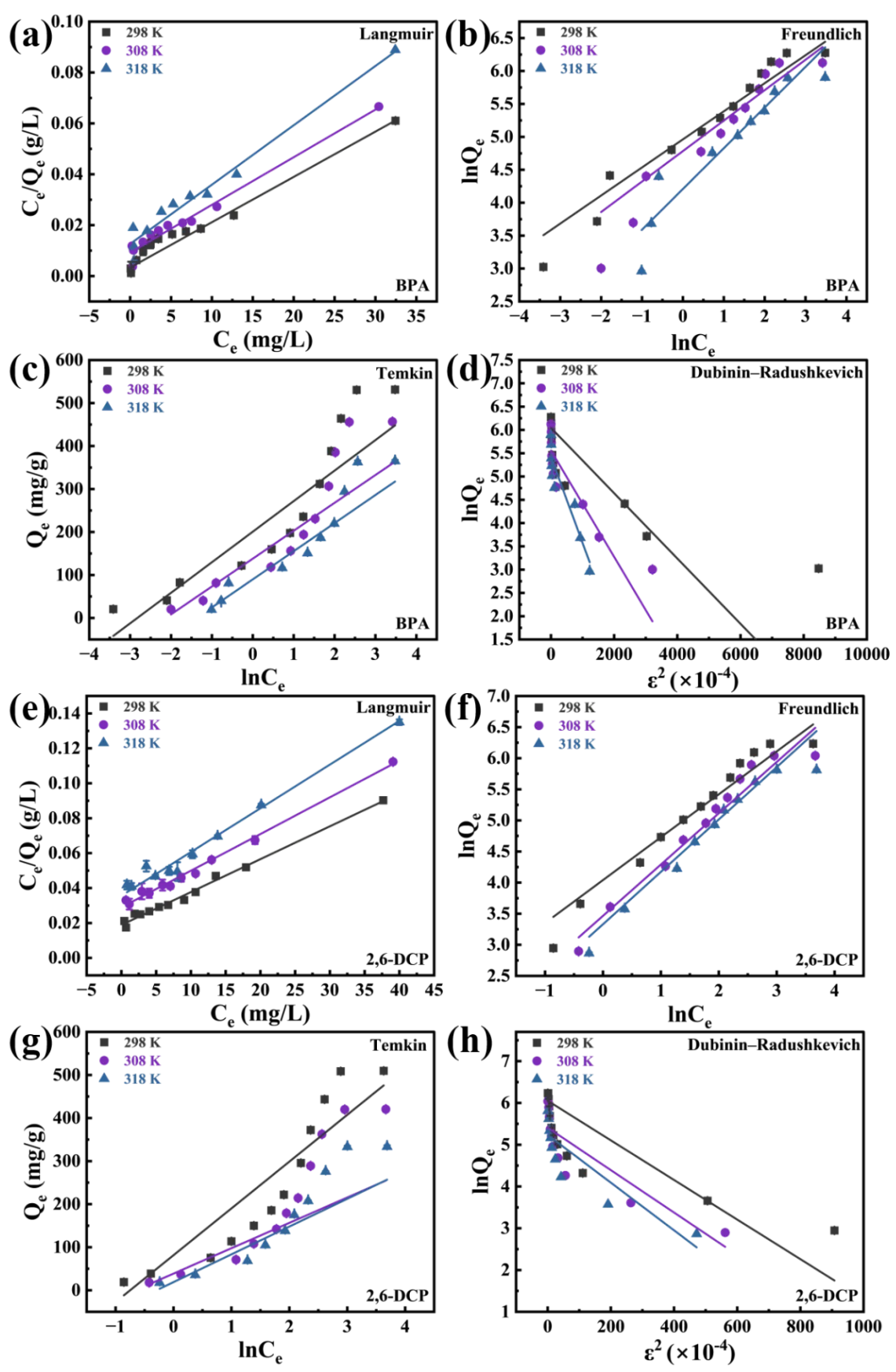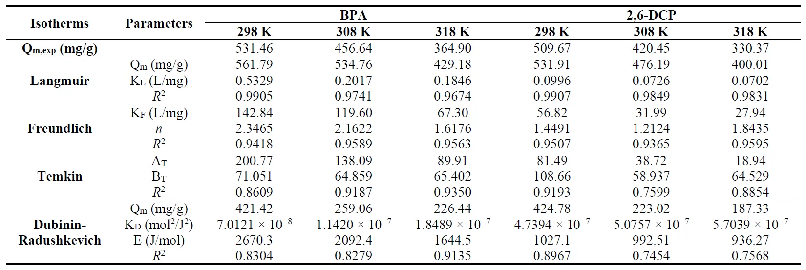 1]. The Temkin isotherm is used as a theoretical model to illustrate that the process involves physical adsorption. The adsorption energy can be evaluated by the D-R parameter. The data in show that the adsorption energies of the two organic phenols at three temperatures are all less than 8 kJ/mol, indicating that physical effects such as hydrophobicity and hydrogen bonding contribute to the adsorption of BPA and 2,6-DCP [